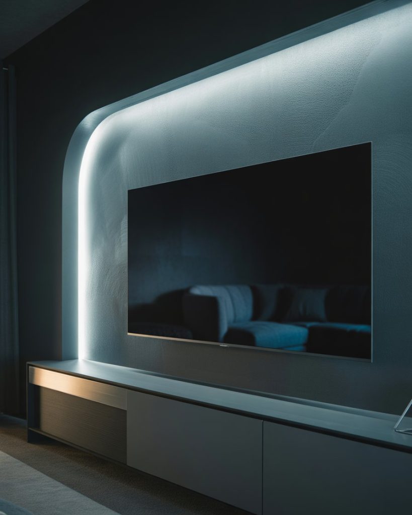 It’s all about curves in 2026. A curved TV wall softens and adds sensuousness to modern luxury living rooms. In place of hard angles, sweeping lines make the wall singular and welcoming. This idea is suitable for futuristic mount tv interior design, and also can soften compact layouts in small spaces.