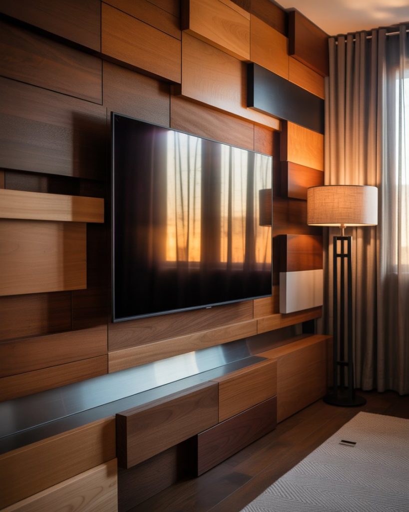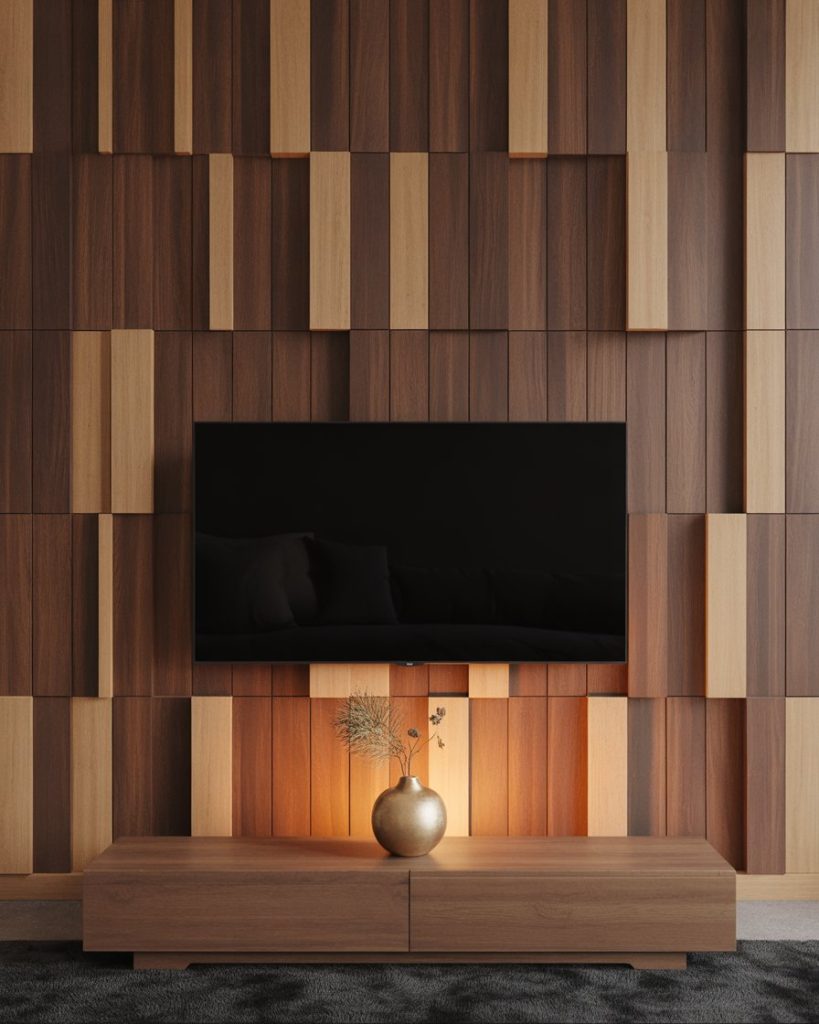 Wood paneling reimagined in geometric or sculptural forms gives the TV wall artistic depth. This idea works beautifully in modern simple luxury spaces or rustic inspired designs, depending on the finish. For small apartments home decor, vertical wood strips make ceilings appear taller. The TV blends into a backdrop that feels both architectural and natural.