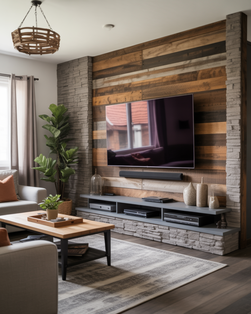 A rustic TV wall lends warmth and authenticity with reclaimed wood, stone, or exposed beams. It’s perfect for fireplace built-ins, and fits nicely in two-story homes with tall windows, but can be adjusted to small apartments home décor with lighter wood tones. This style roots your space in tradition while feeling very fresh. Designers such as Joanna Gaines have demonstrated how rustic touches can be comforting without being a sacrifice to glamorous style.