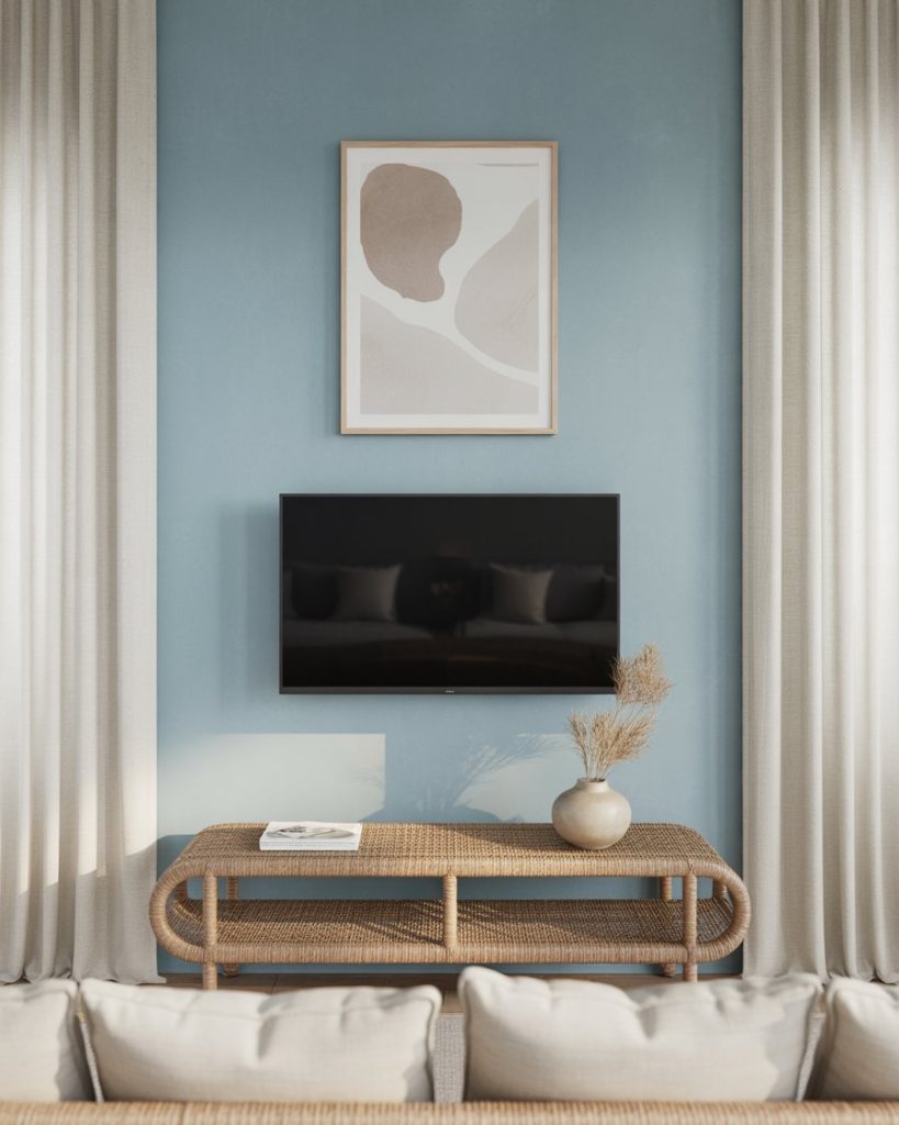 A coastal TV wall would feel about relaxation, sandy neutrals, soft blues, and woven textures. When conjugated with wide windows, the TV lets itself slip into the flowing interior. This option is a real plug for small apartment interior design, turning even city homes into sanctuaries. As per the work of Shea McGee, the coastal style really shines a light on natural illumination and ease, casting the TV as part of a serene ambiance rather than a distraction.