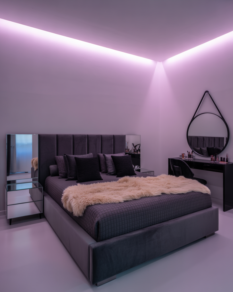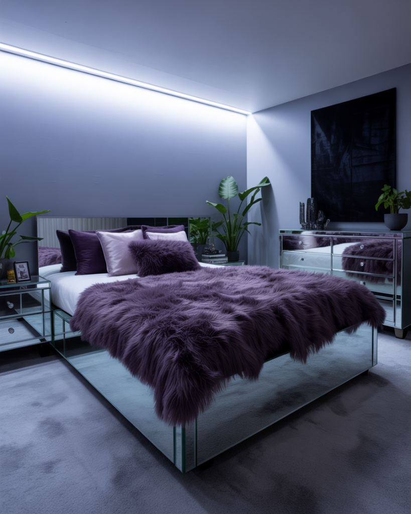 A baddie bedroom is the one that leans into all things bold and beautiful: mirrored furniture, LED-lighting, and sleek color palettes. The style has grown popular among the teenagers and young adults for an Instagram-worthy vibe. Refinery29 suggests consciously juxtaposing glam details such as faux fur throws with compact furniture that sits nicely against burgeoning worldly concerns of space and style.