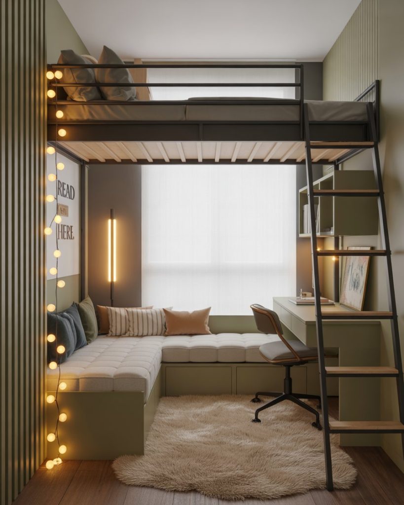 In situations where real estate is scarce, loft beds can wonderfully jump in by raising the sleeping area while also making space for a study desk, wardrobe, or lounge below. This is particularly useful for teens who desire both privacy and productivity. According to designers at Architectural Digest, using height rather than width is one of the smartest ways to expand a room. Just a nice warm rug and some layered lighting will make the entire space into a very flexible area beneath the loft.