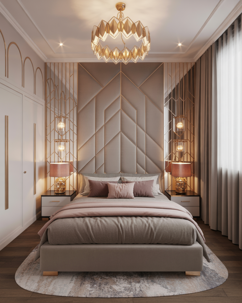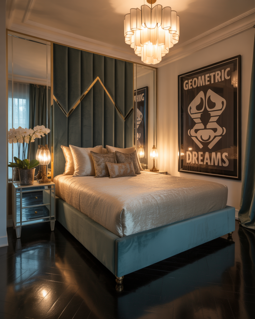 Small spaces, if given an Art Deco touch, instantly reach new heights. Attention glossy finishes, geometric patterns, and gold accents-Bold personality does not need large furniture. The style works in a couple’s bedroom longing for both romance and sophistication. Elle Décor says, “consider a statement light fixture or note-worthy patterned wallpaper with a strong presence that demands attention, while occupying as little physical space as possible.”