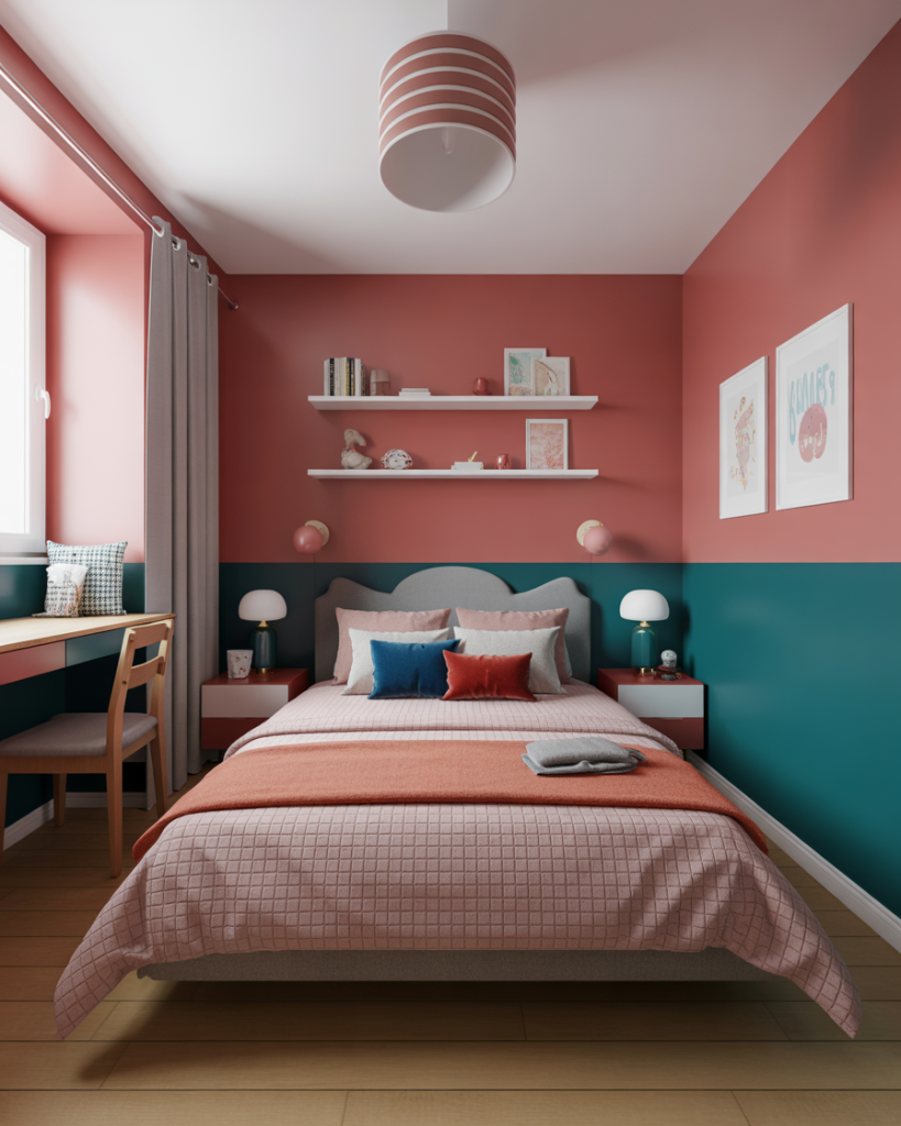 Small bedrooms especially if shared by two kids or maybe roommates can easily be set up with zones-even color blocking. A more straightforward method can be to paint half of the wall in one color and the other half in a different color; this is how these colors create some visual separation without actual partitions. Apartment Therapy suggests bright pinks, teals, or mustards with neutral backgrounds; these keep spaces fun yet structured.