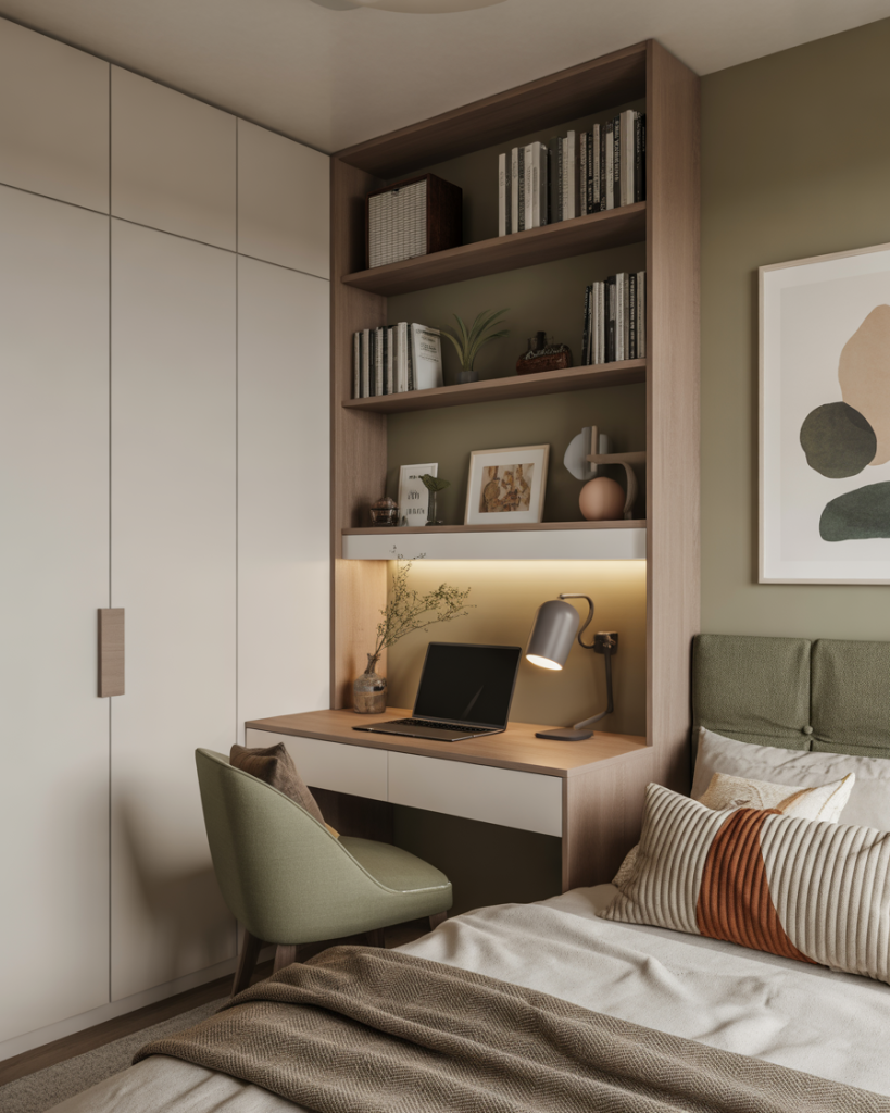 Setting up a study desk in the wall niche is a clever option for small bedrooms because it frees up some floor space inherently. It also carves out a distinct working zone. The use of the bedroom mostly by teenagers and students is an advantage to this grace, especially with apartments in which anything must be multipurpose. As The Spruce mentions, compact desks, in combination with floating shelves, provide a nice balance of visual organization and productivity without infringing on comfort.