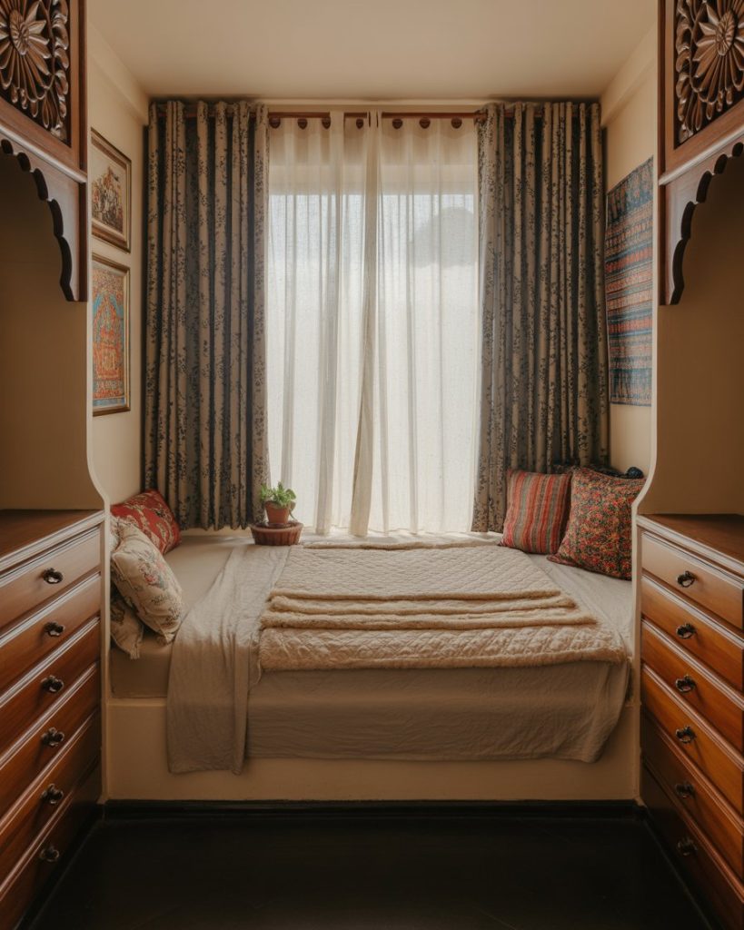 The quaint alcove with a single bed would have saved a lot of space and allowed for natural light to filter in. In India, this setup is very common and thus creates a natural nook for anyone wanting to curl up with a book. Layered curtains, built-in drawers, and fluffy bedding lend to the mini retreat feel. According to Architectural Digest, window alcoves offer privacy while giving the feeling of space, thereby combining utility with style.