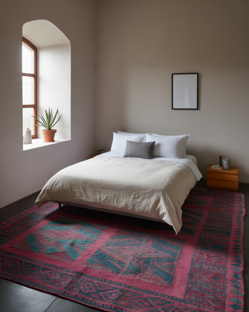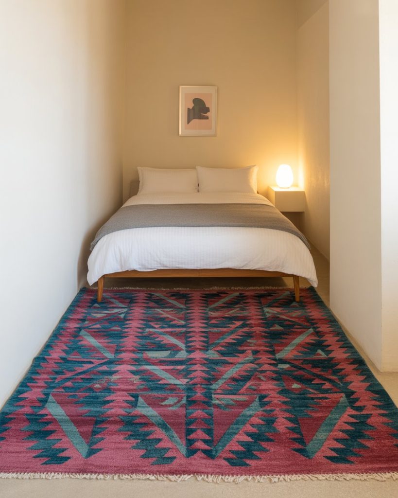 A bold-colored rug instantly transforms a tight space. Be it pink, geometric, or bohemian, a rug anchors the furniture and adds that special warmth to the ambience. A common thought shared among designers at House Beautiful is that rugs are rarely taxed for space, quite akin to artwork placed underfoot. Minimalist beds and straightforward furniture provide balance, thereby, allowing the floor to serve as the expressive design-element.