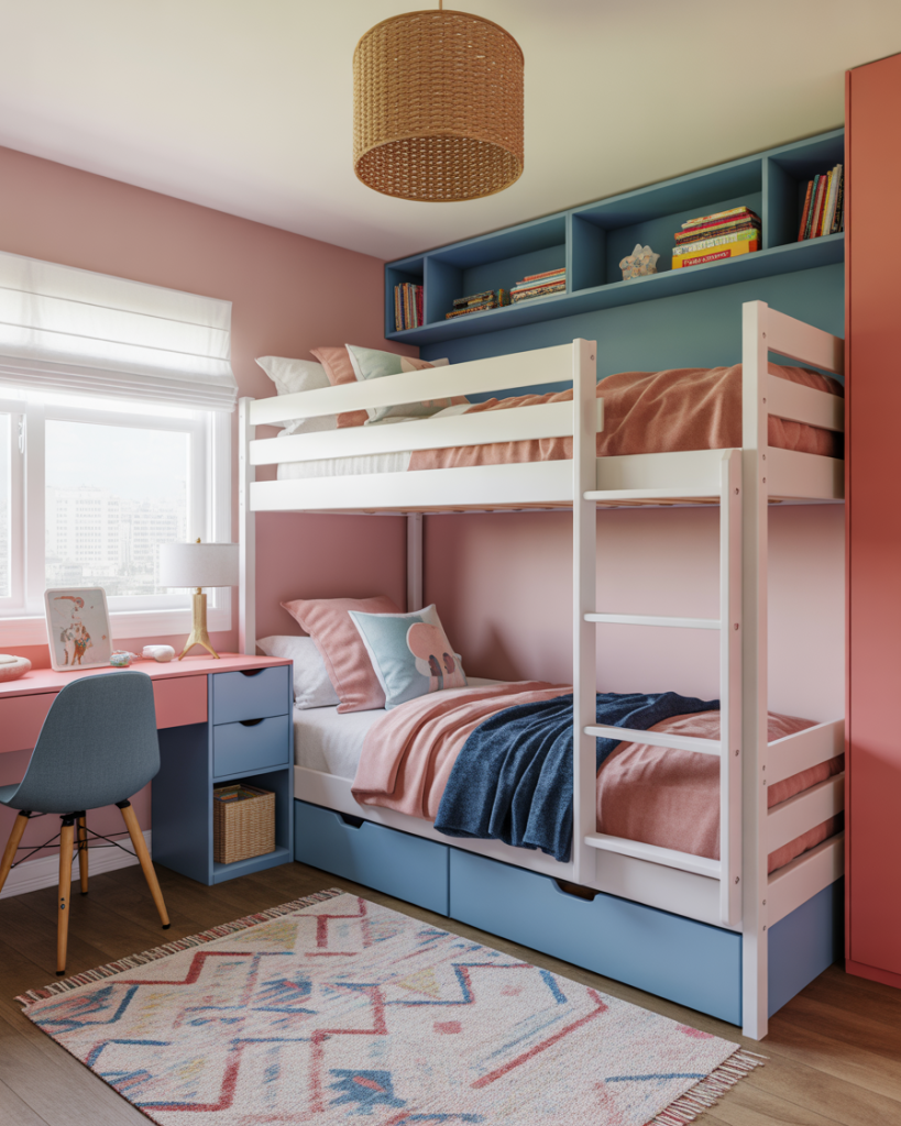 A room for two kids should promote creativity. Bunk beds or lofted arrangements go along with two slim single beds with under-storage for maximum functionality. Add some playful boho-themed rugs or wall art to inject character. Parents on Pinterest claim that color zoning-whether it be two different pinks or two different blues-helps to give each child their very own little nook, whereas the rest of the design keeps everything cohesive.