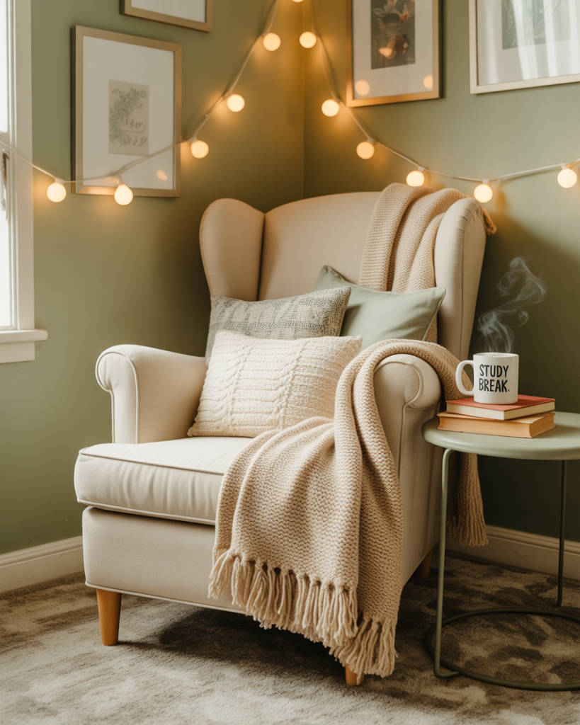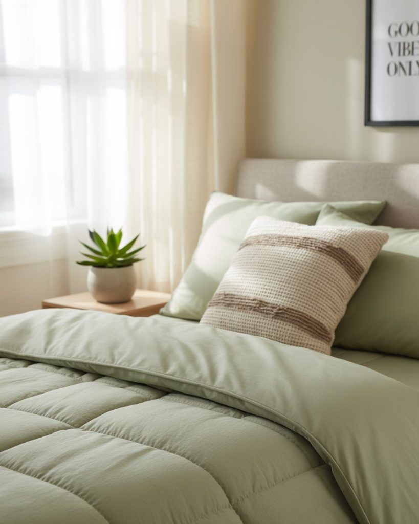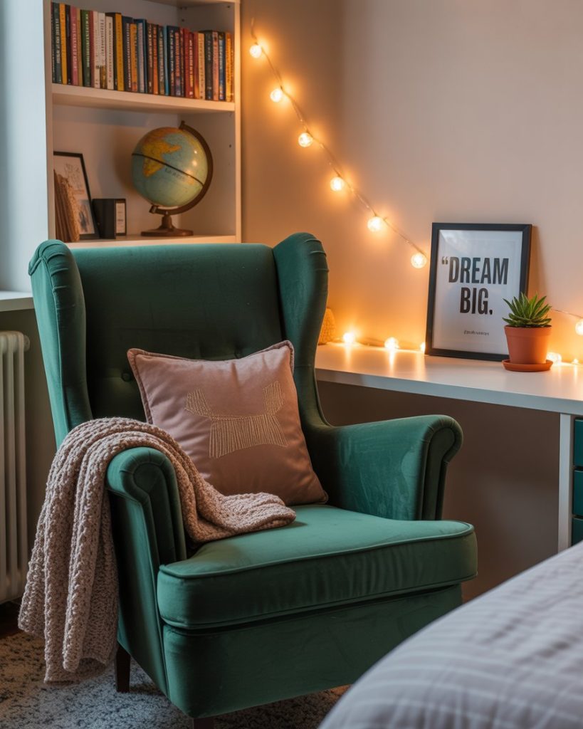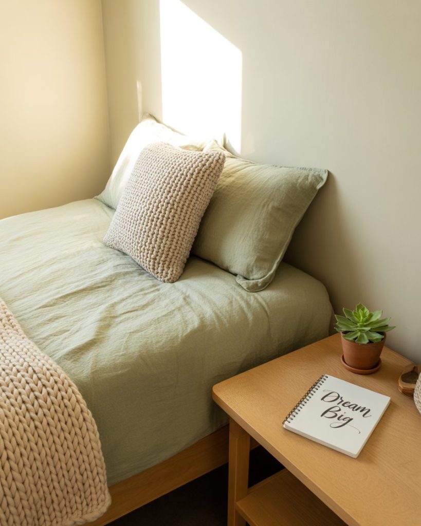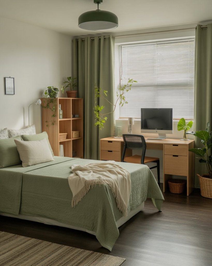 Bringing in earthly and green tones will make the dorm feel grounded. A sage green comforter alongside leafy plants and wood accents can give the feel of a calm retreat. This context proves much useful for bustling college acts, where refreshing elements can make study breaks nice. In design circles, green has been celebrated time and again, including by Emily Henderson, as having a healing effect in small spaces.
