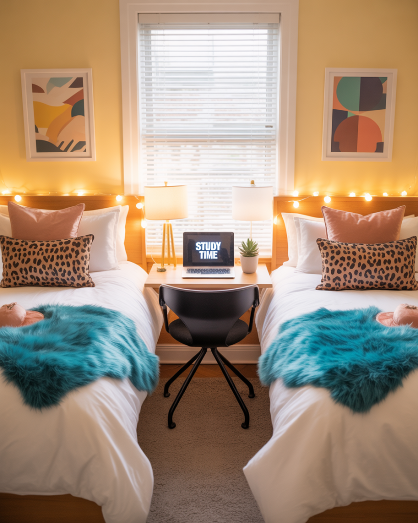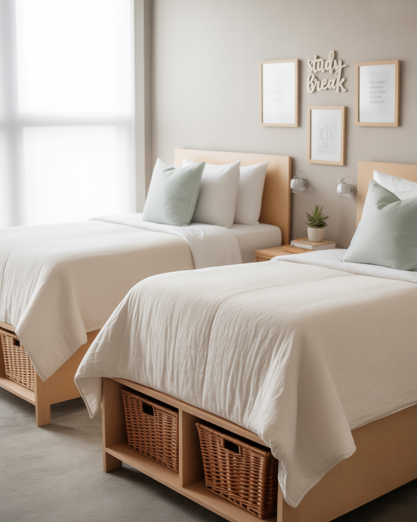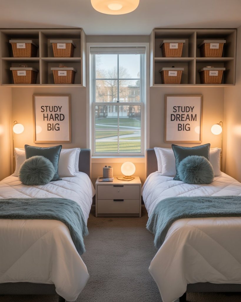 A double dorm requires coordination with your roommate. Either neutral tones, blues, or pinks-materialize a combination that works for both of them. Symmetry in bedding and furniture continues to promote the balance, while individual touches allow for some level of self-expression. Apartment Therapy decorators suggest choosing shared storage to keep things neat and calm.