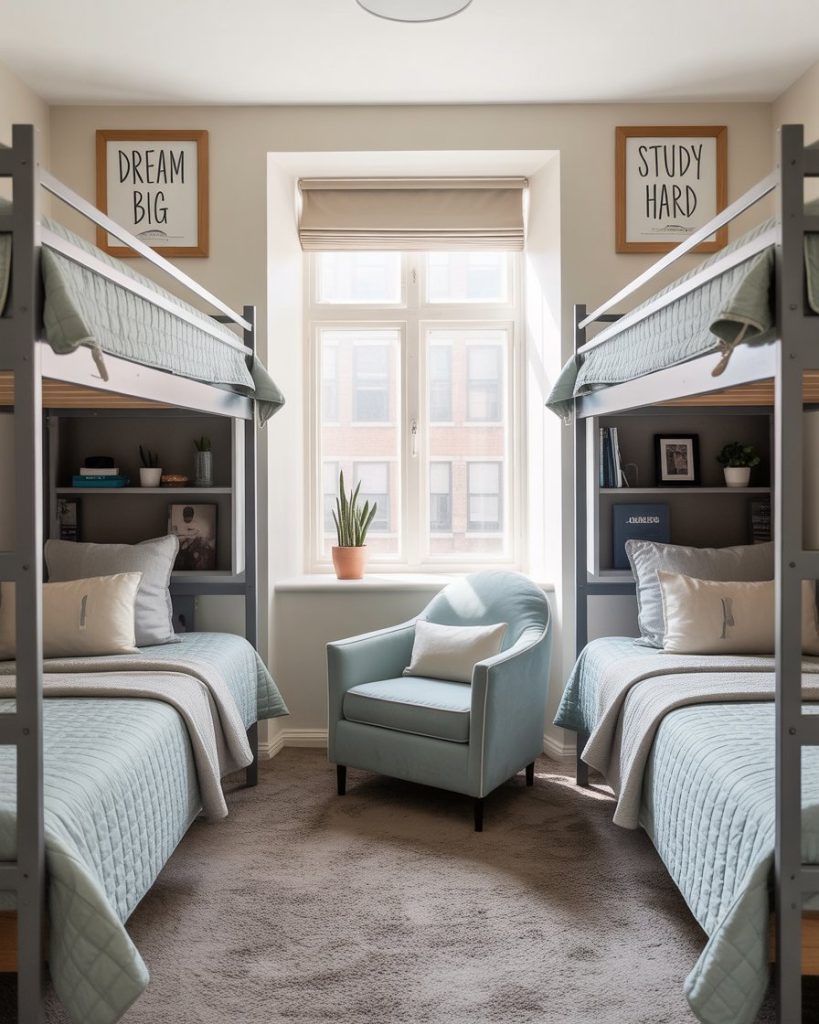 The triple dorm should be an imposing kind of setup; thus, use minimal decor and work with a common theme to achieve balance. Colors such as neutral beige, light blue, or earthy greens go toward unifying the room. Personal corners will still shine with cute little accents. Most lifestyle blogs will say lofting beds here to save on floor space.