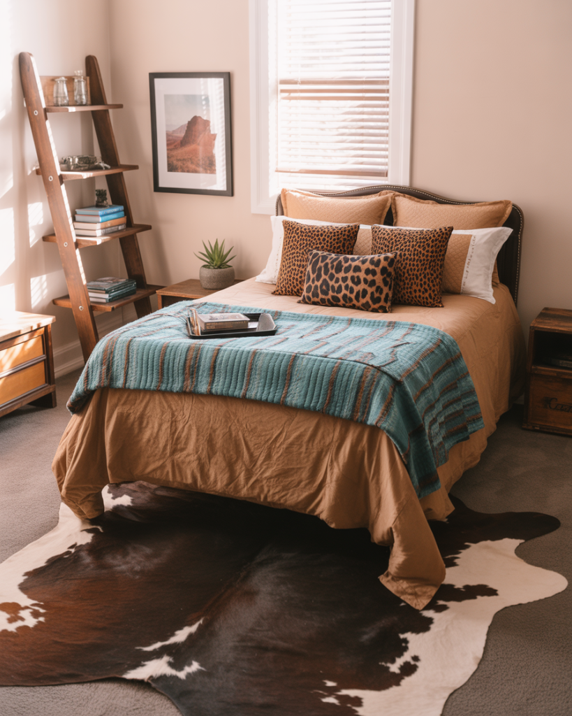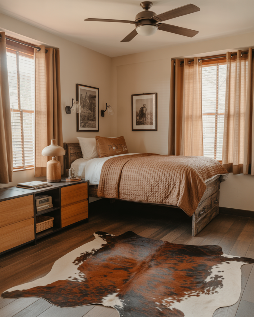 Adding a little Western flavor with cowhide rugs, rustic wood, or cheetah-print throw pillows brings life into the dorm. Such choices are loud enough to straddle the line between rugged and aesthetic, creating a statement. This style is popular for those from little rural towns entering college who want to imbibe shared rooms with a bit of home feeling.