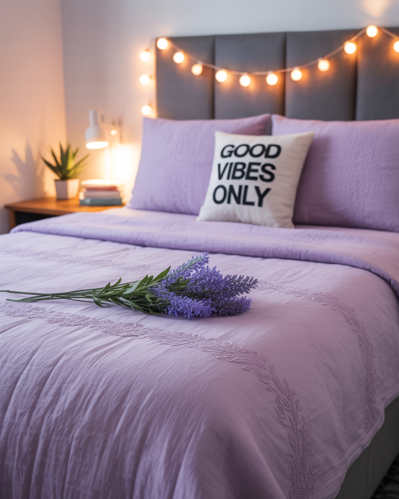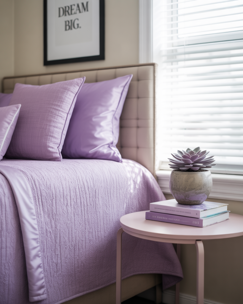 Adding purple is a bold way to make a statement. Lavender bedding, violet desk accessories, or deep plum curtains can glitter even a shared dorm. This shade goes so good with neutrals like beige and gray, forging an ambiance of balance. Purple would work better when someone wants to feel very cozy in their dorm but wants the interior to be aesthetically appealing, a combination that interior writer Apartment Therapy is always excited about.