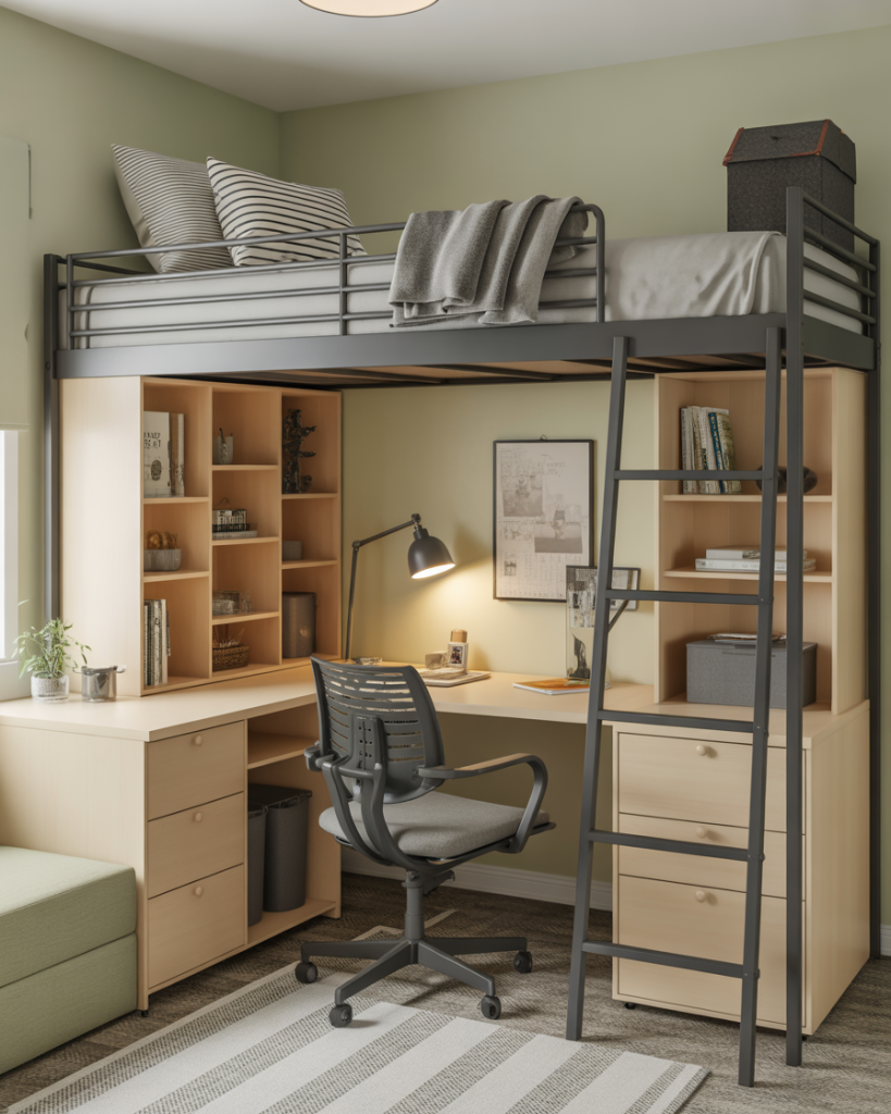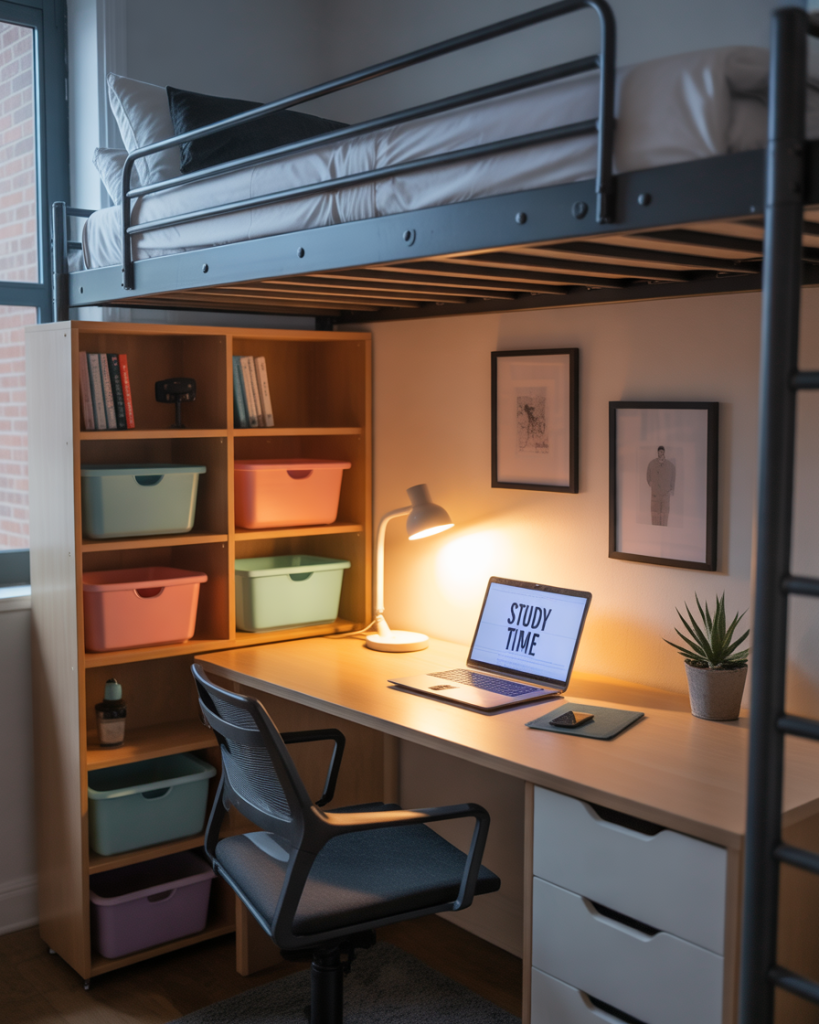 A loft bed is among the best options for small dorms. By lifting the bed, floor space is opened up to make room for a desk, futon, or organization bins. This setup fits perfectly with double and triple rooms where every bit of space matters. Dorm bloggers like The Spruce emphasize lofted layouts to maximize what very small rooms can offer, both for practicality and style.