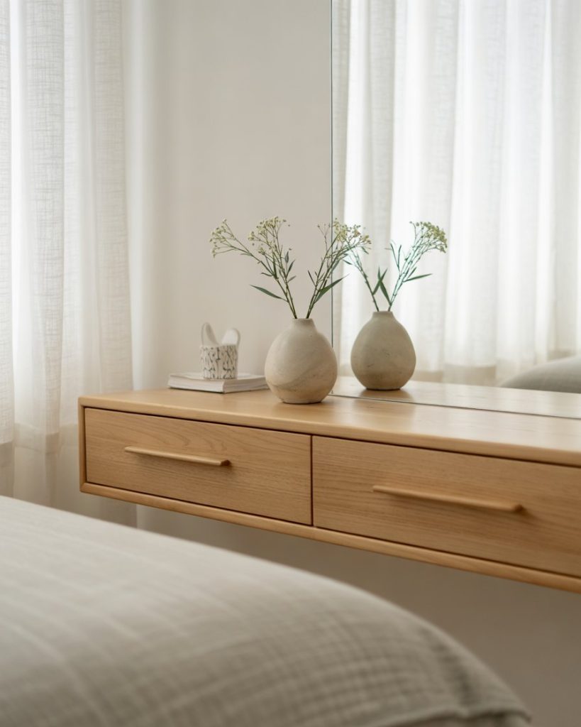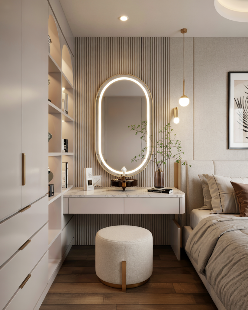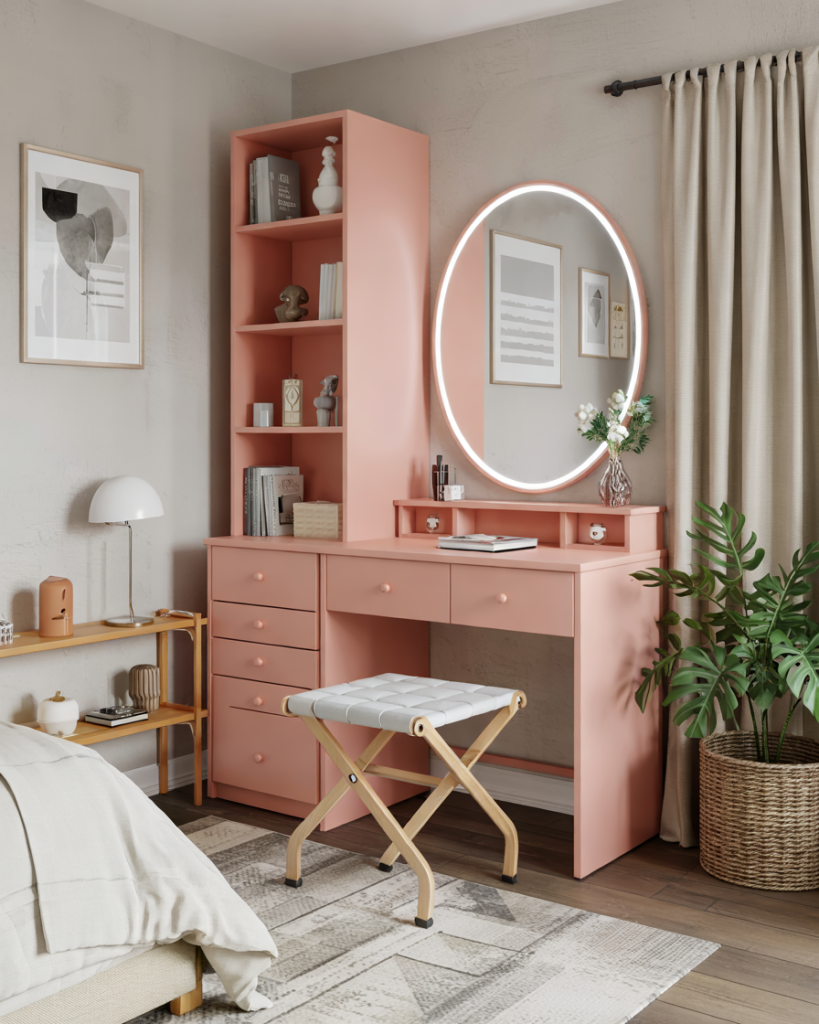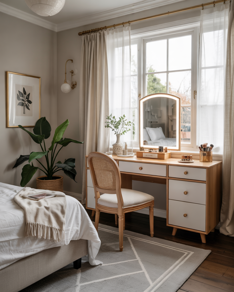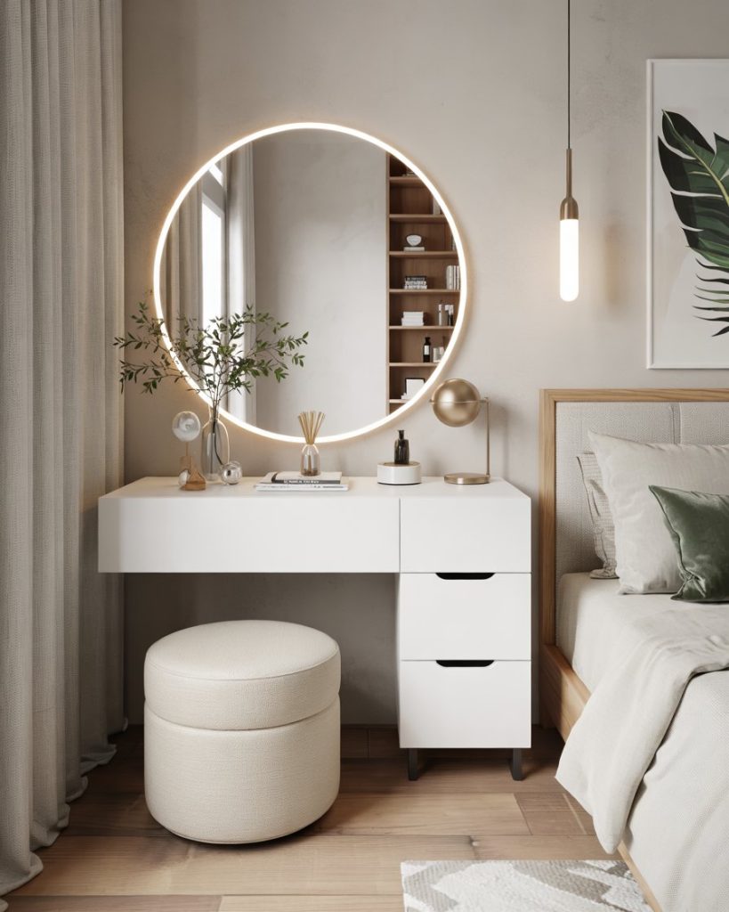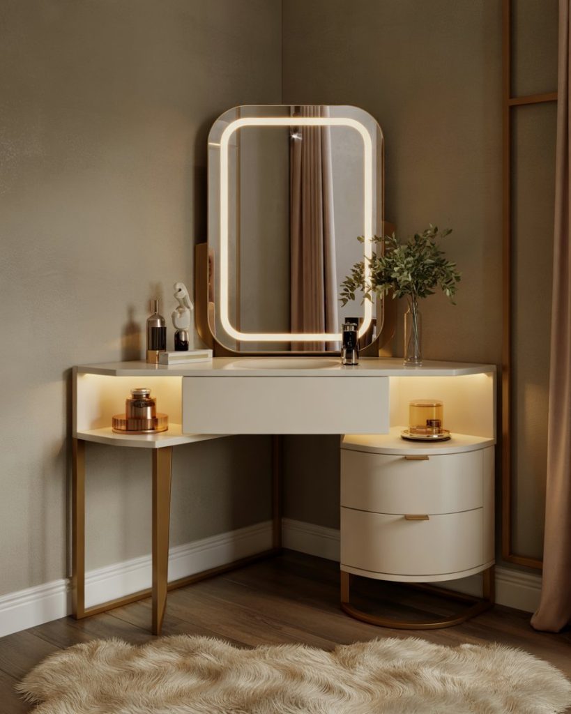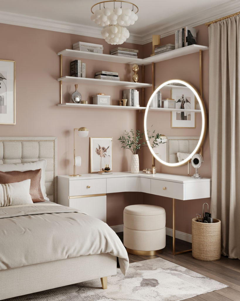 A corner vanity brings glam into underused space while keeping the floor clear for better flow. A wall-mounted shelf, soft light, and sleek mirror can transform a forgotten corner into a polished beauty zone. Perfect for modern bedrooms, it offers easy organization and a boutique feel, even in a small room.