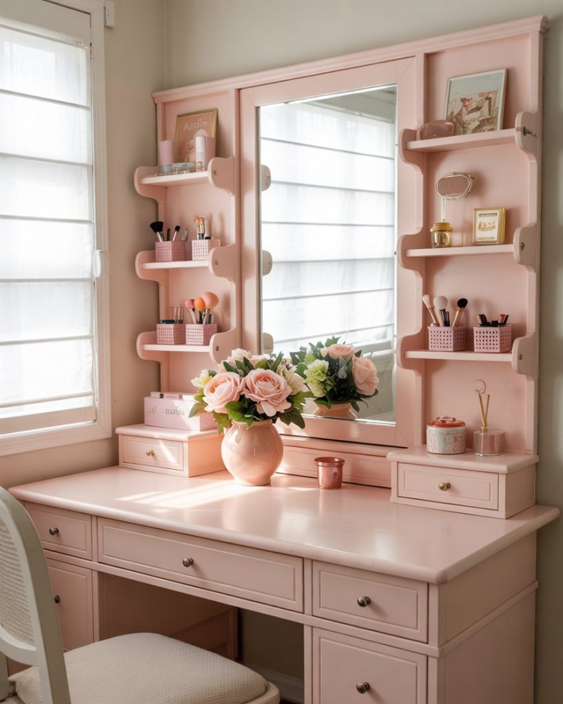 Bright, fun, and functional, an aesthetic preppy vanity adds spirit to your corner makeupsetup. For playful charm, choose pastel tones, patterned accessories, and crisp white shelving. Creative organization feels neat. It’s personal, elegant, and full of energy, using labeled bins and clear jars.