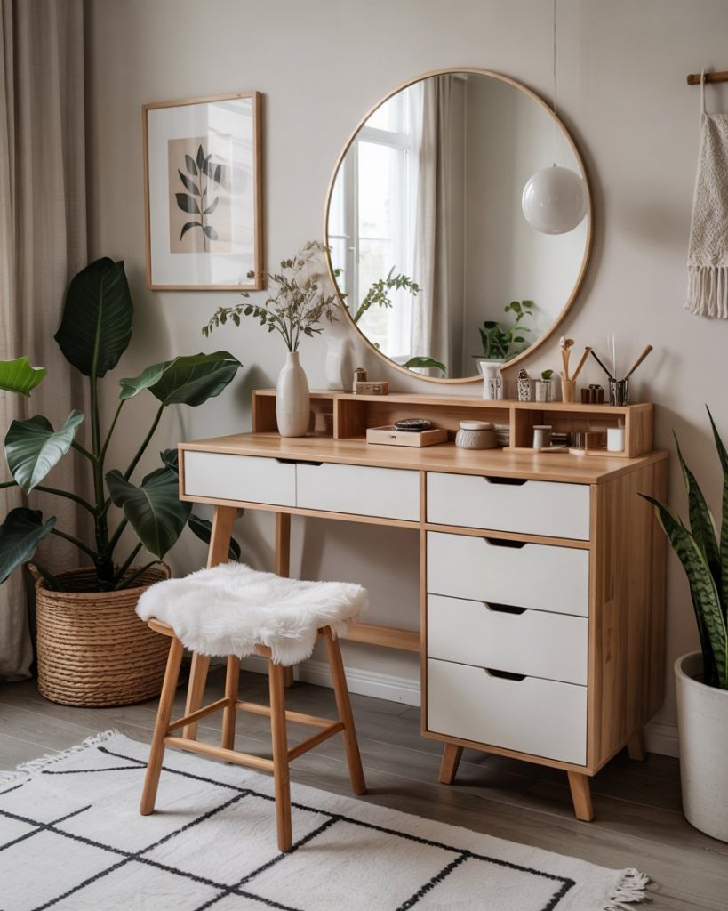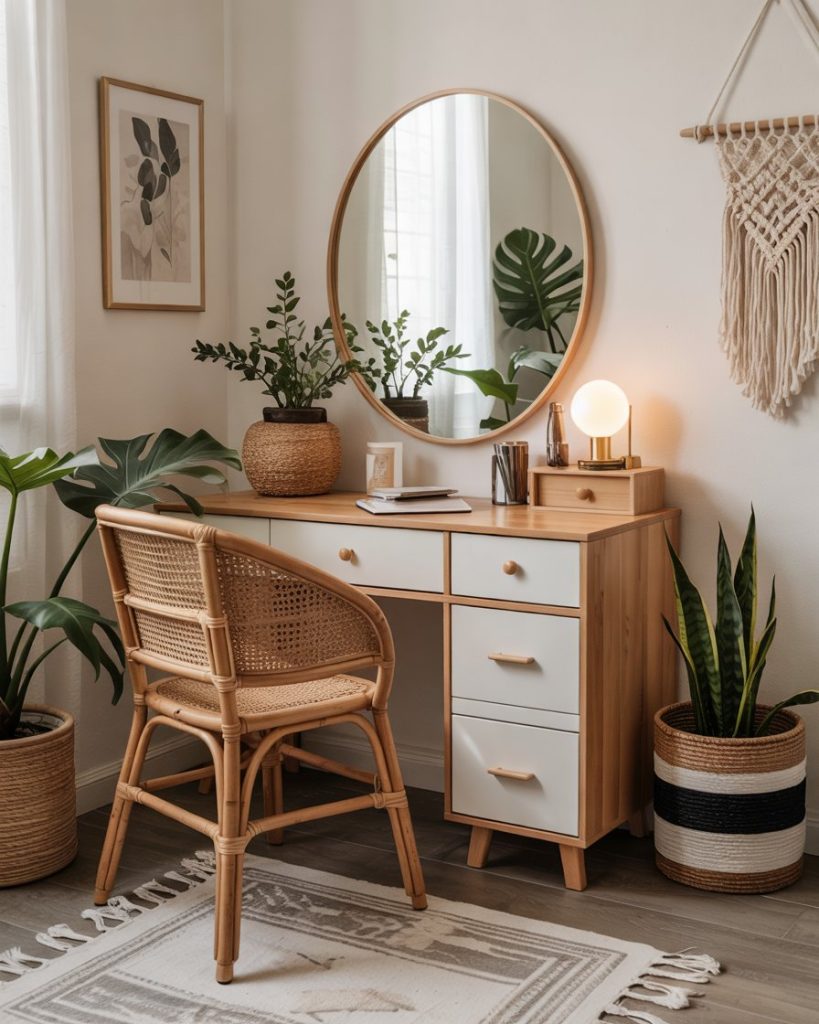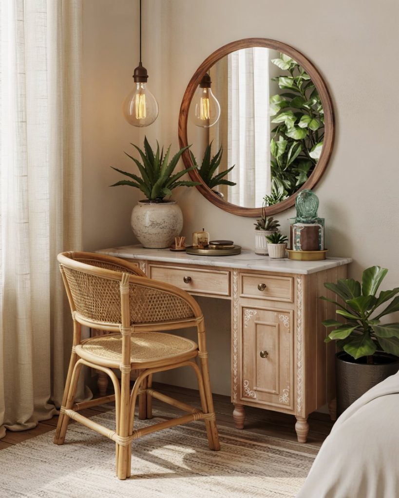 A boho vanity celebrates relaxed charm with woven baskets, rattan stools, and earthy decor touches. Add a large mirror framed in wood, drape soft fabric, and sprinkle in some greenery for a calming feel. This aesthetic fits perfectly for free spirits who love organic textures and soft colors in their modern homes.
