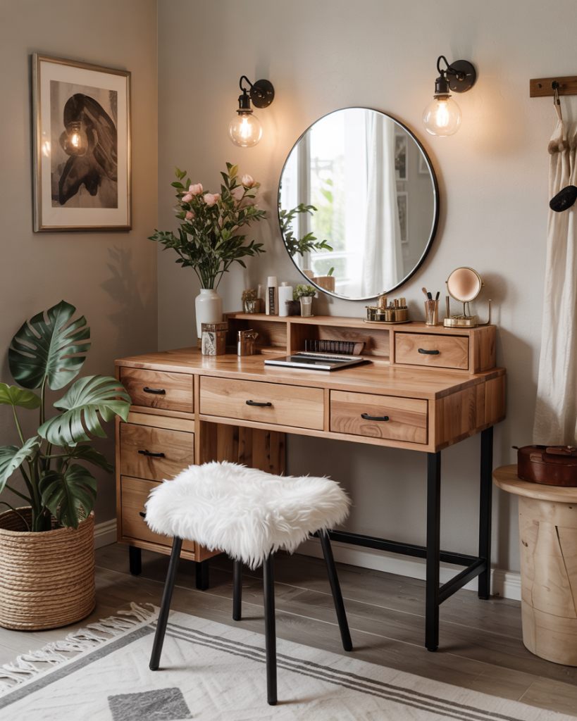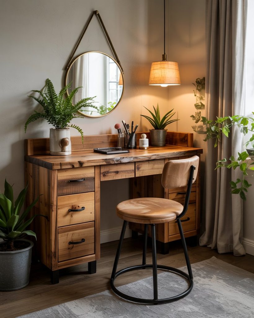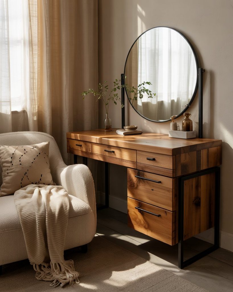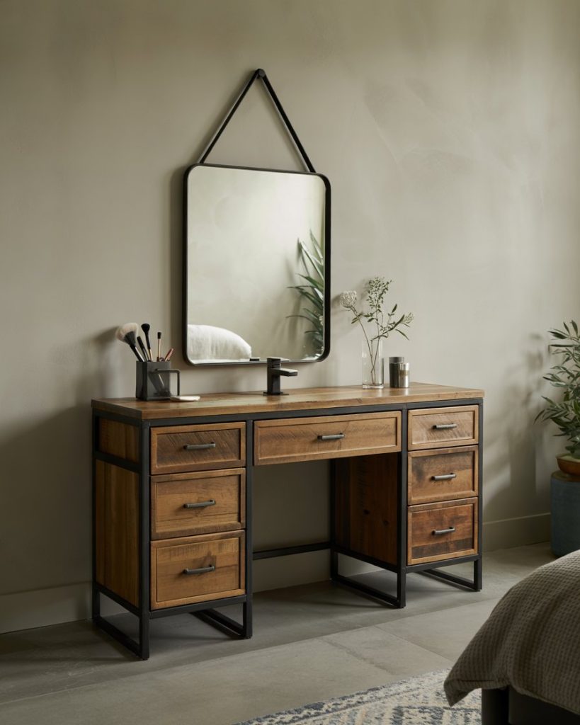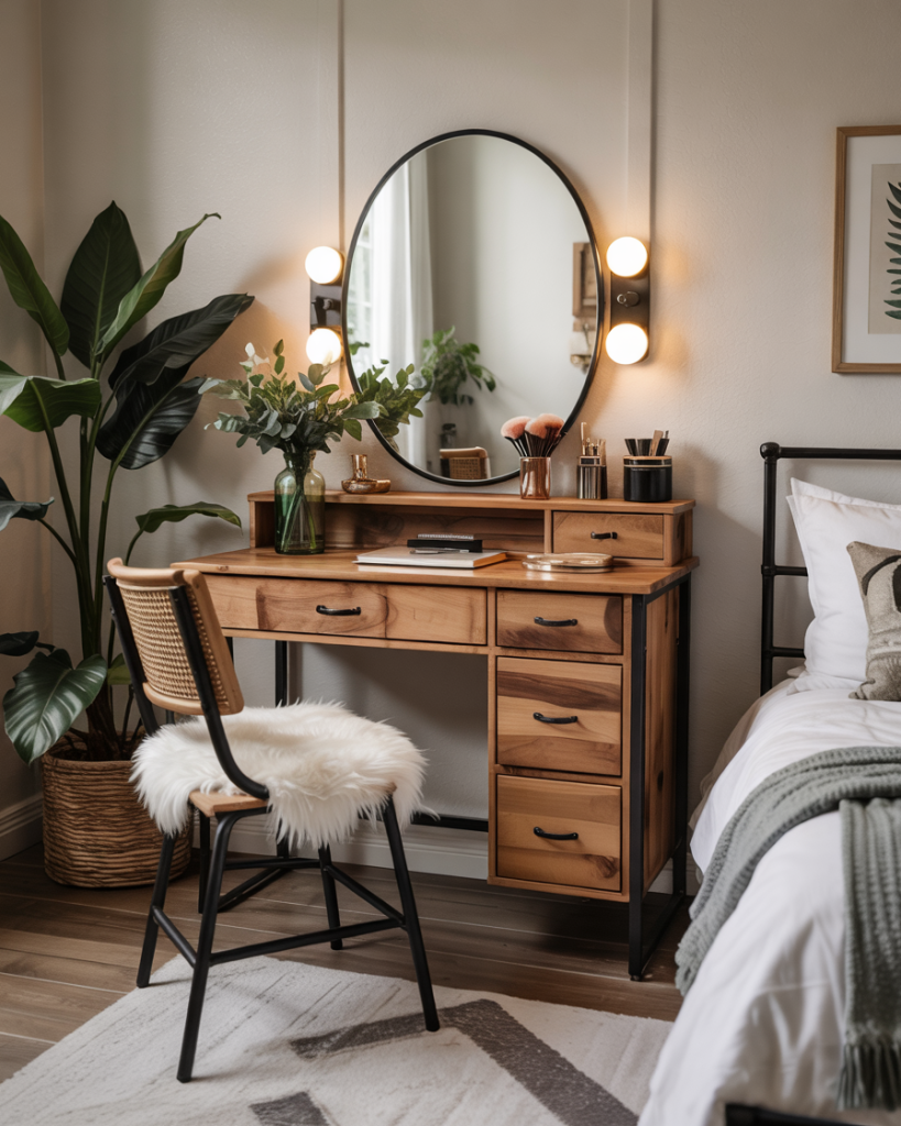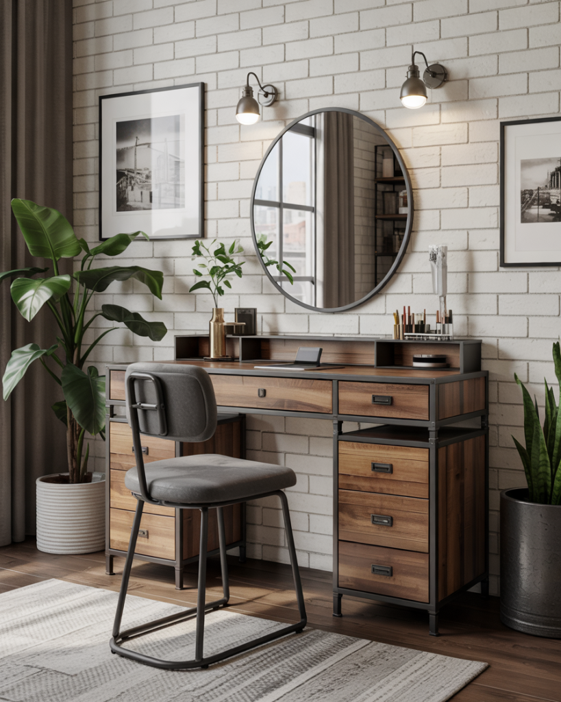 If you crave urban energy, an industrial vanity with steel accents and black finishes sets the tone. Pair a matte floor lamp, exposed screws, and a raw wood surface for rough charm. A mix of materials creates a modern yet vintage-inspired aesthetic, ideal for loft apartments or bold city bedrooms.