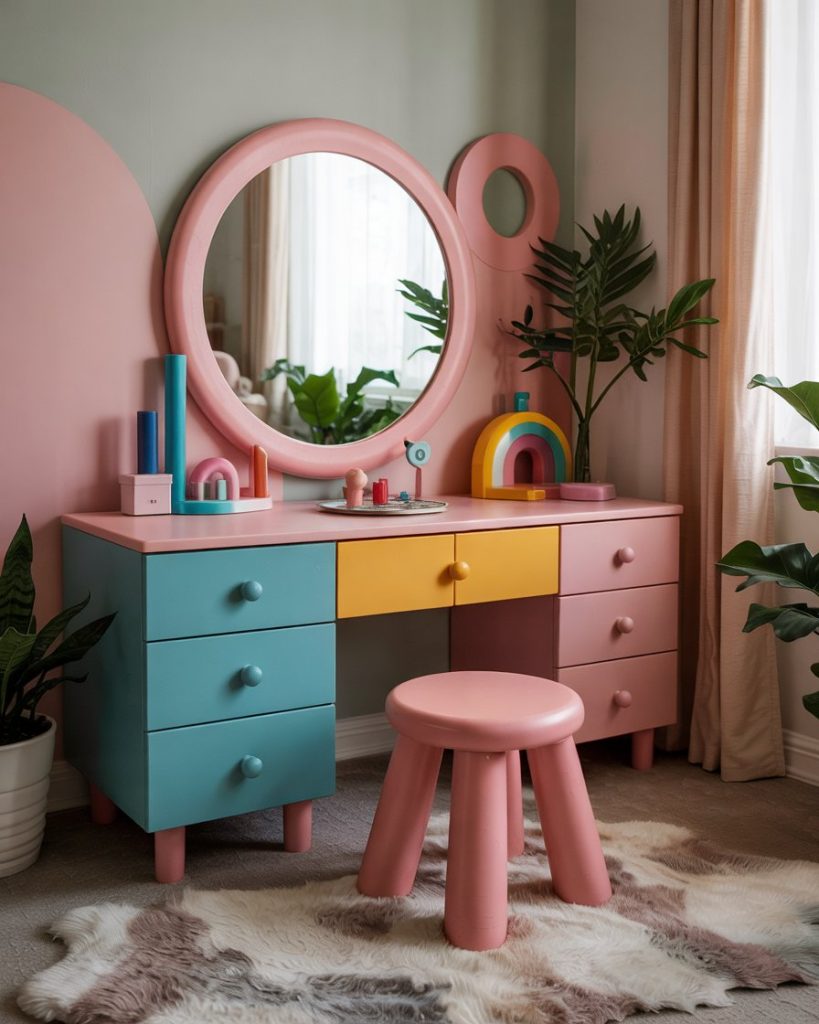 Pastel colors, bold patterns, and playful decor are the hallmarks of a Toca Boca-themed vanity. Use bubble mirrors, cheerful stools, and fun tiered textures to create a relaxed yet modern atmosphere. This decor idea will bring a sense of joy to any vanity area.