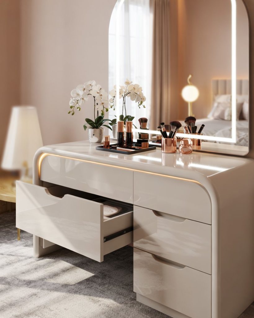 A vintage vanity with curved shapes, brass handles, and a softly glowing mirror brings timeless glam to your decor. It’s elegant, romantic, and works beautifully in both modern and classical rooms. Add lace runners, antique trinkets, and a floral stool for a nostalgic yet refined atmosphere.
