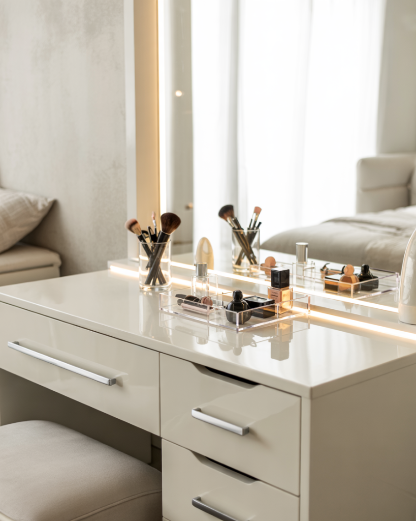 You can create a private vanity nook using a portion of your wardrobe. Built-in shelving, simple lighting, and closed cabinetry allow your beauty space to be personal and unobtrusive, keeping surfaces clean. This idea is perfect for small spaces, bringing an elegant, organized, and uncluttered look.
