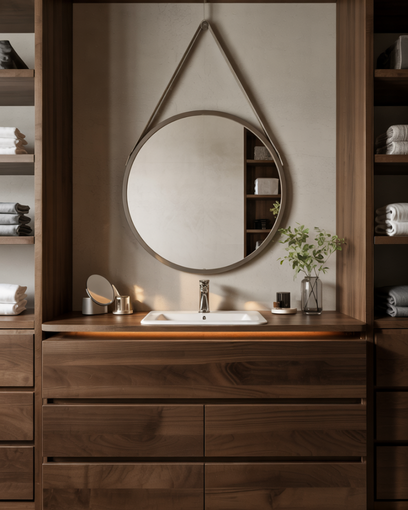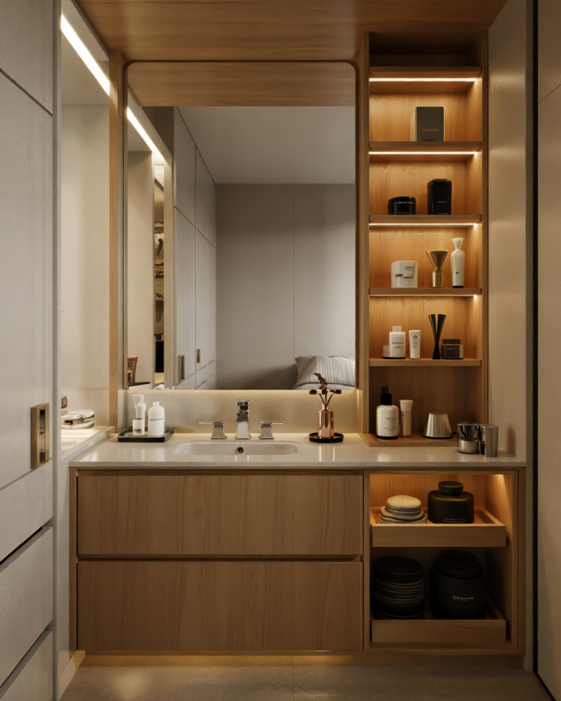 For a luxurious touch, install a built-in vanity wall with LED mirror panels and marble or quartz surfaces.