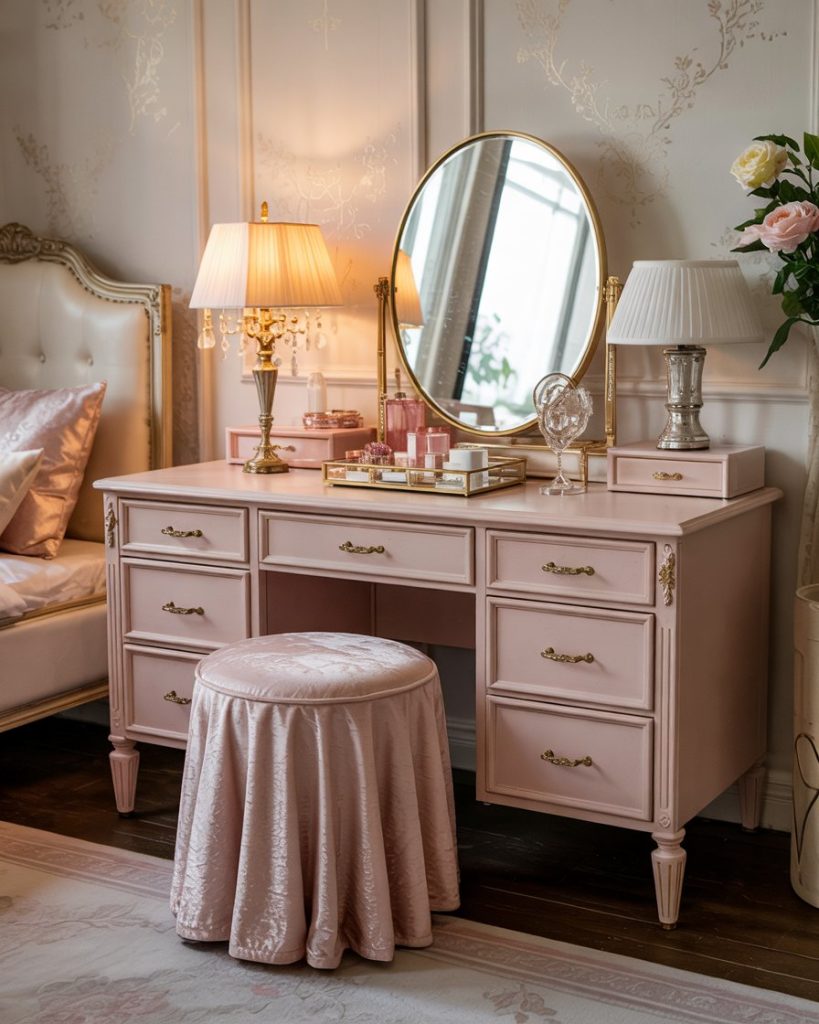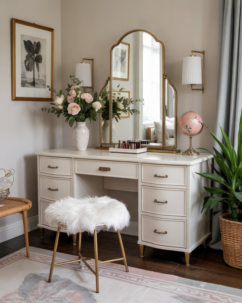 4. Vintage Chic Vanity with Curves and Glam Touch