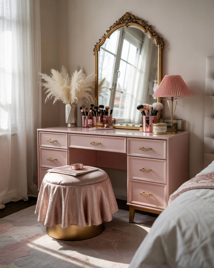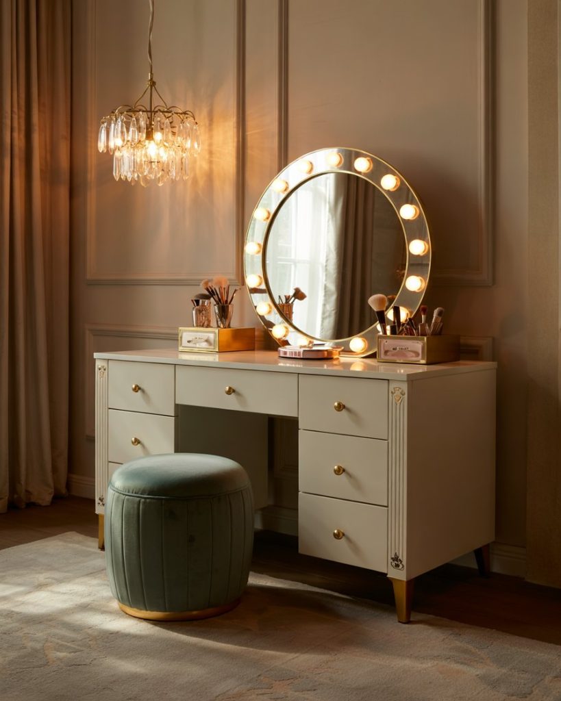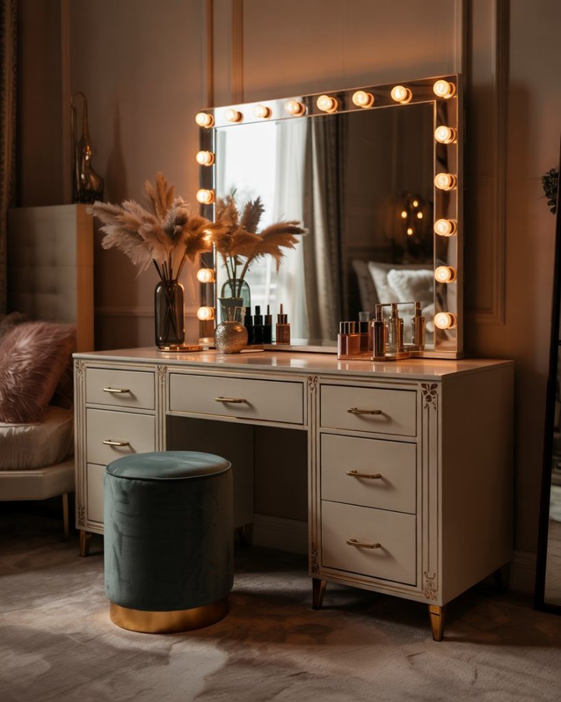 8. Glam Hollywood-Style Vanity with Velvet Stool