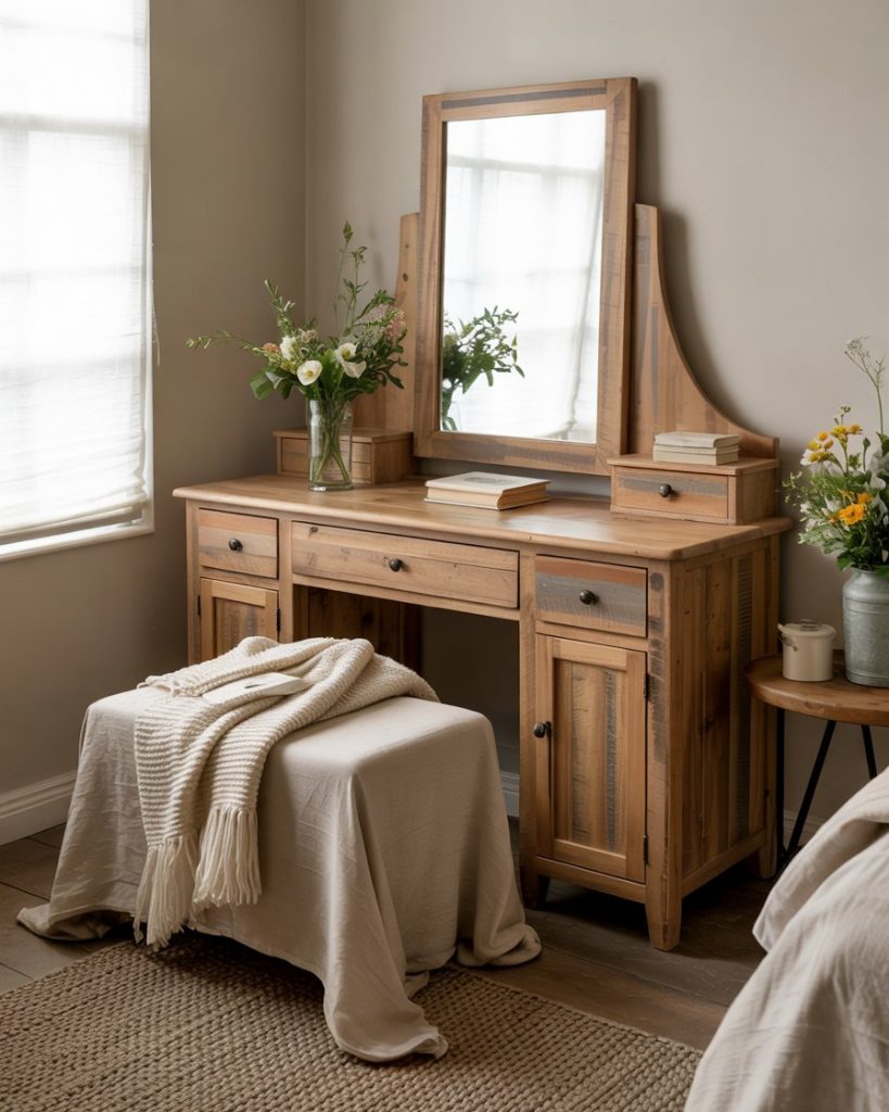 A rustic vanity framed in warm wood creates a soothing retreat. Choose reclaimed timber, linen upholstery, and black metal accents for a grounded aesthetic. This design works beautifully in both rural homes and modern apartments, bringing comfort and natural charm to your daily routine.