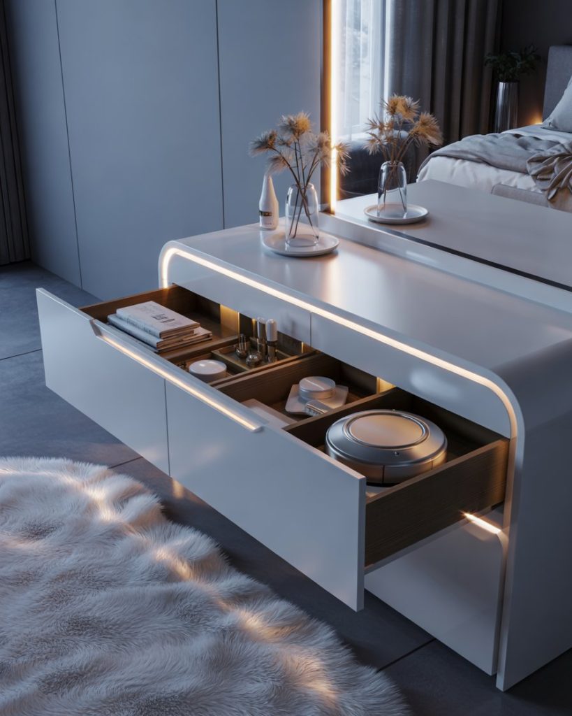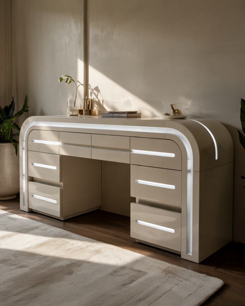 Modern LED vanity with touch controls and ambient lighting takes you to a new era. Smart mirrors increase and decrease brightness, while lined hidden drawers keep your makeup neat and tidy. The combination of high-tech and elegance is ideal for anyone who loves innovation and style.