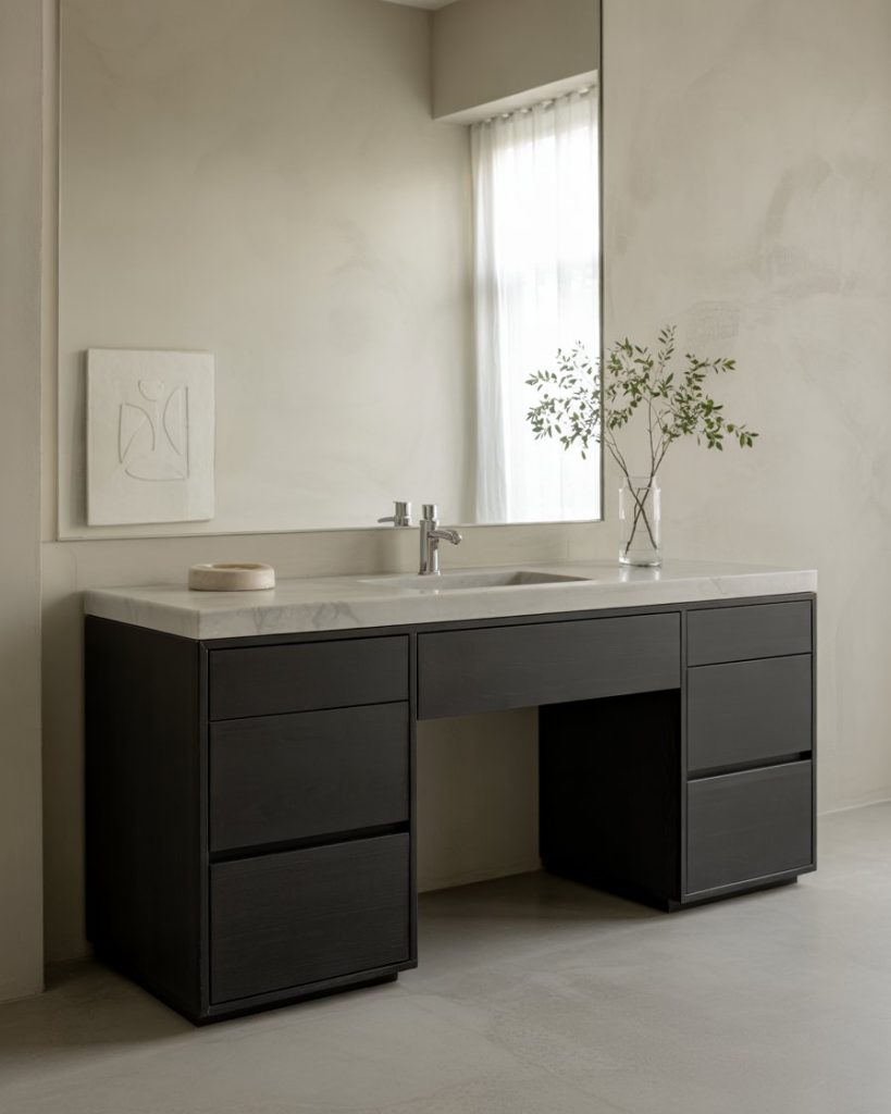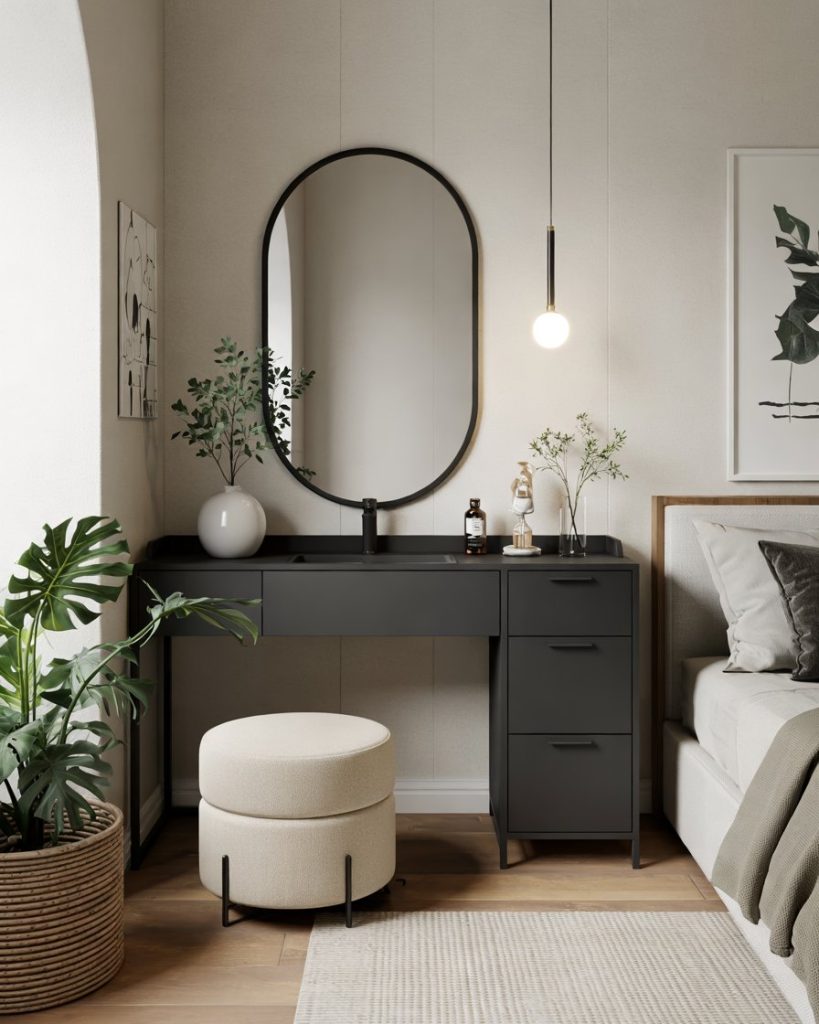 A minimalist black vanity embodies quiet sophistication. Go for a matte surface, simple hardware, and hidden drawers for organization. This crisp, clutter-free setup highlights your aesthetic while offering a balanced modern tone. It’s an effortless way to create visual calm and contrast in any space.