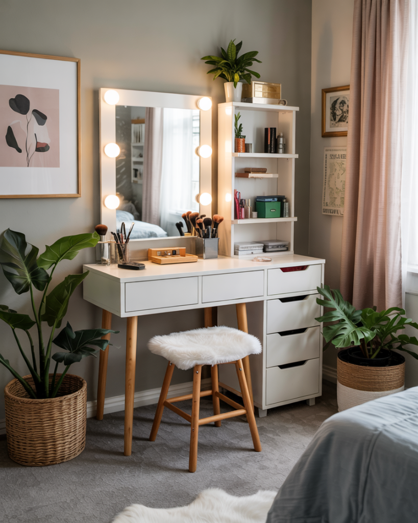 Create a stylish DIY vanity using affordable Ikea pieces. A compact desk, mounted mirror, and modular shelving can make your small room both functional and fashionable. Use drawer inserts and trays for organization and soft LED lighting for a modern, simple finish. It’s flexible, budget-friendly, and totally customizable.
