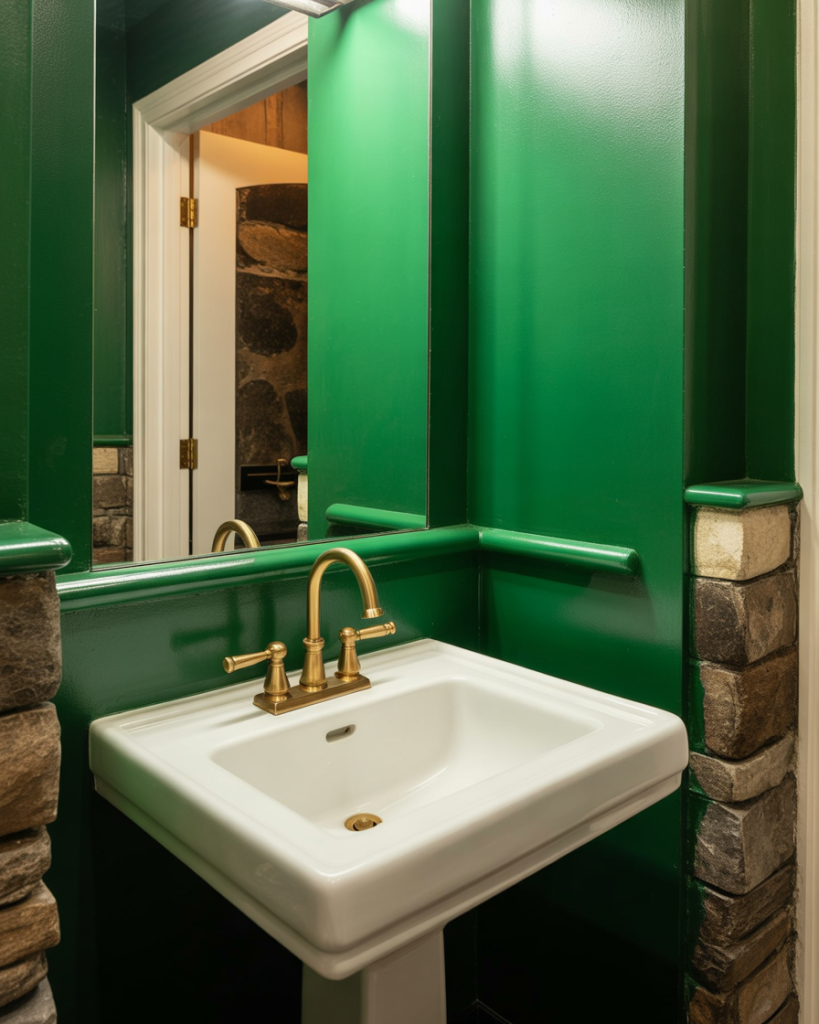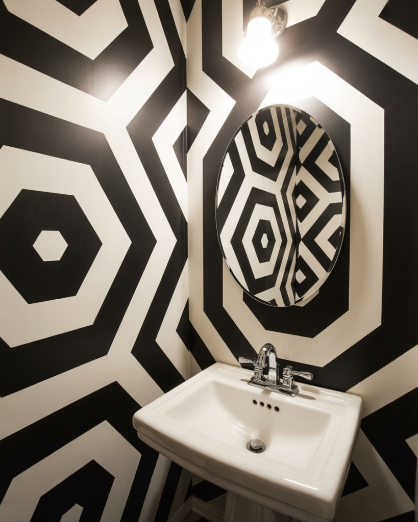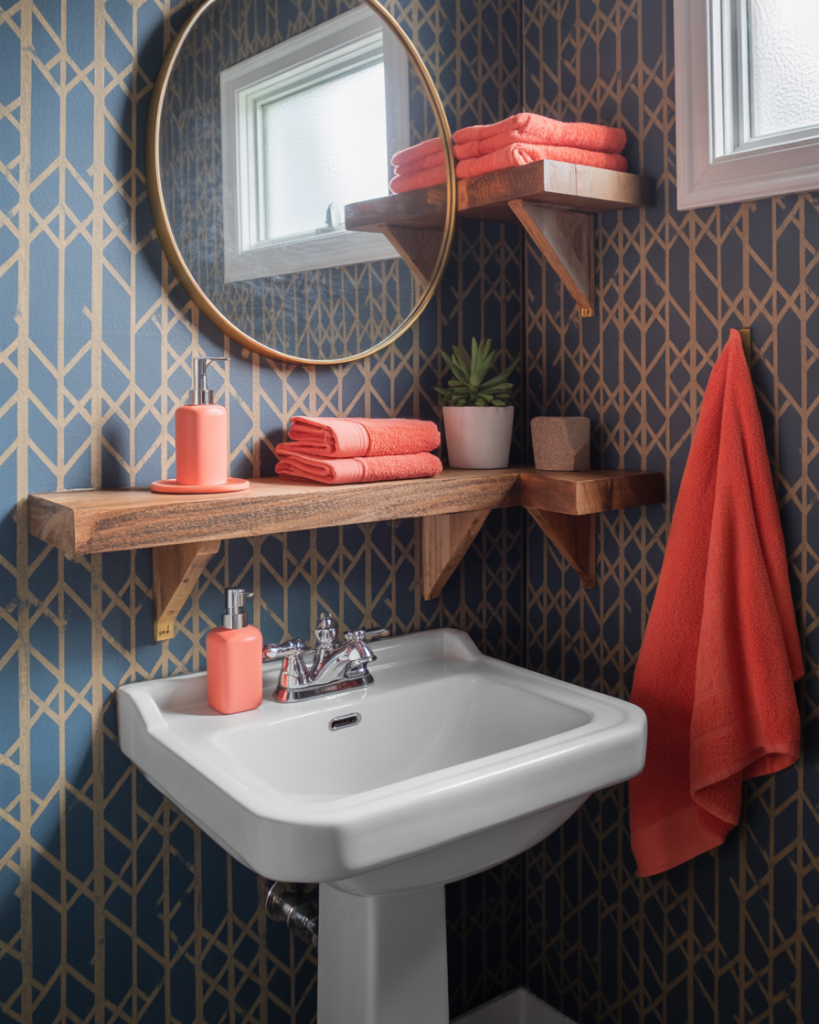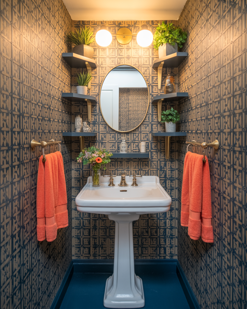 A large pattern in a small room sounds risky, but it actually blurs corners and makes the space read bigger. Overscale florals, retro geometrics, or hand-drawn murals become instant conversation starters. Interior stylists say half baths are the one place you should go “too far” on purpose.
