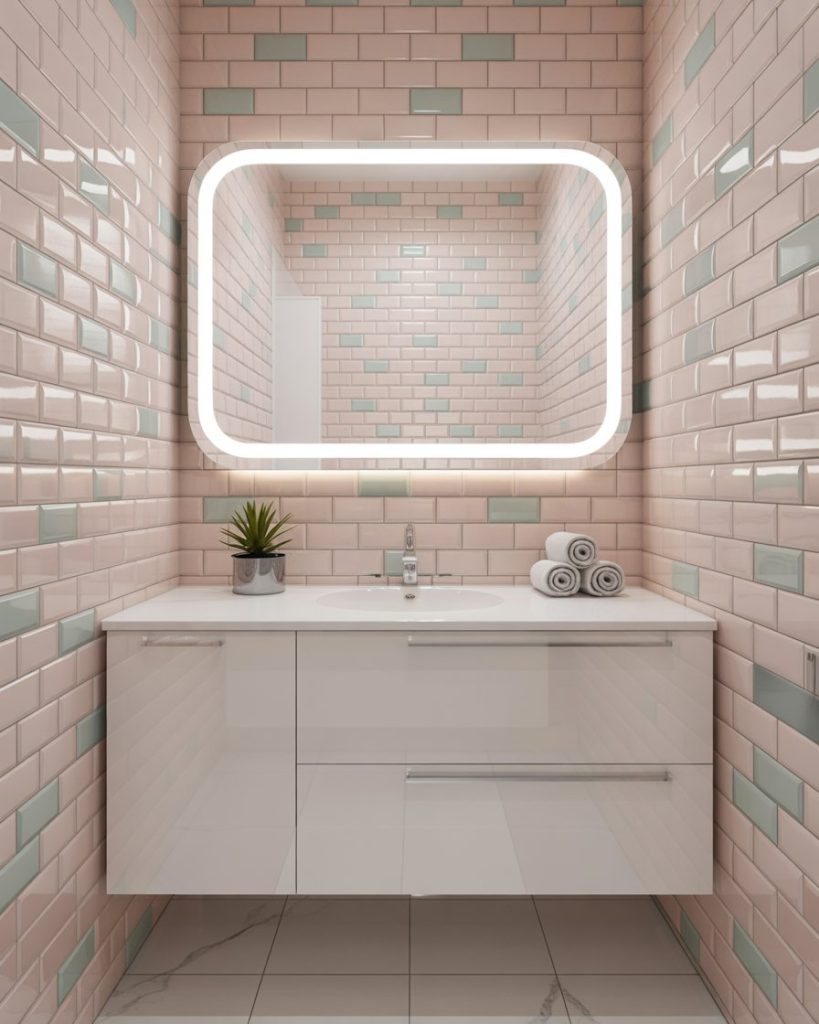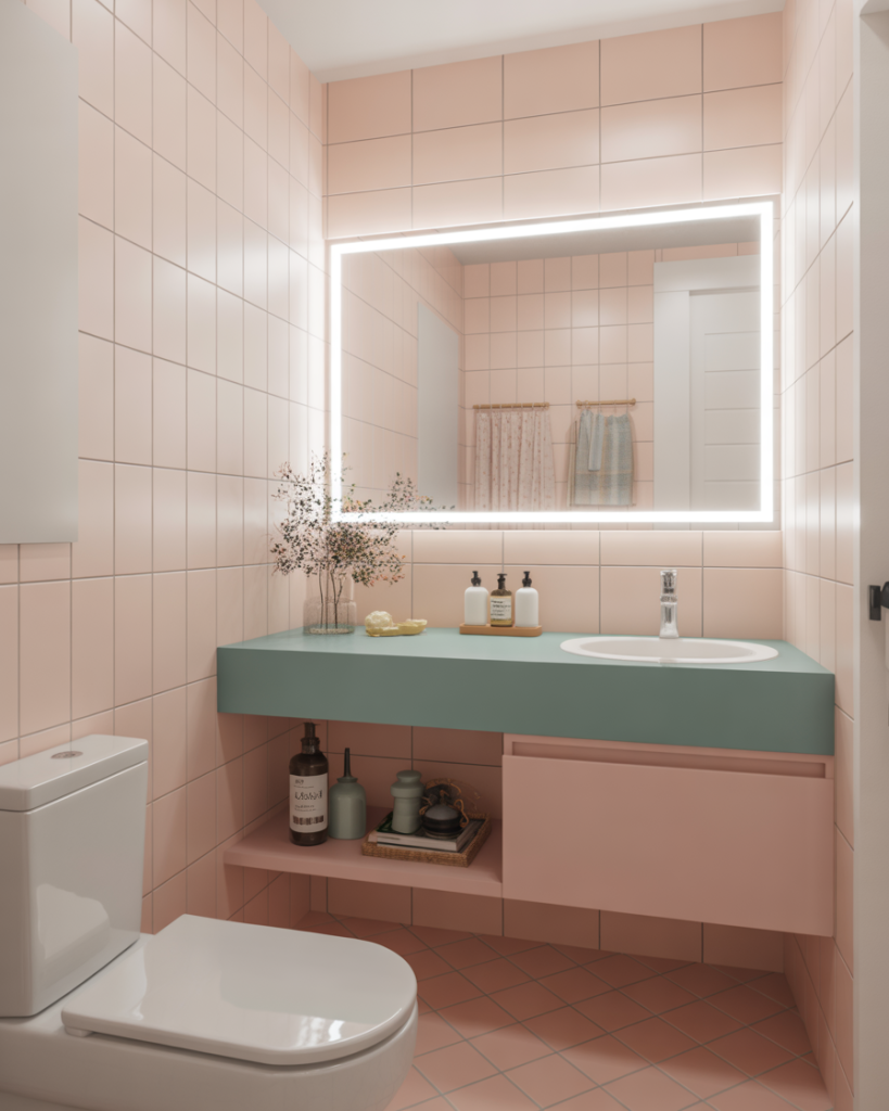 Fans of Bloxburg builds know the formula: sleek layout, floating storage, LED mirrors, and cute pastel accents. A modern small guest bath in this style mixes playful colors with practical organization. Everything has a place, and nothing feels heavy. This look resonates with younger homeowners and gamers who want real-life versions of their virtual spaces.