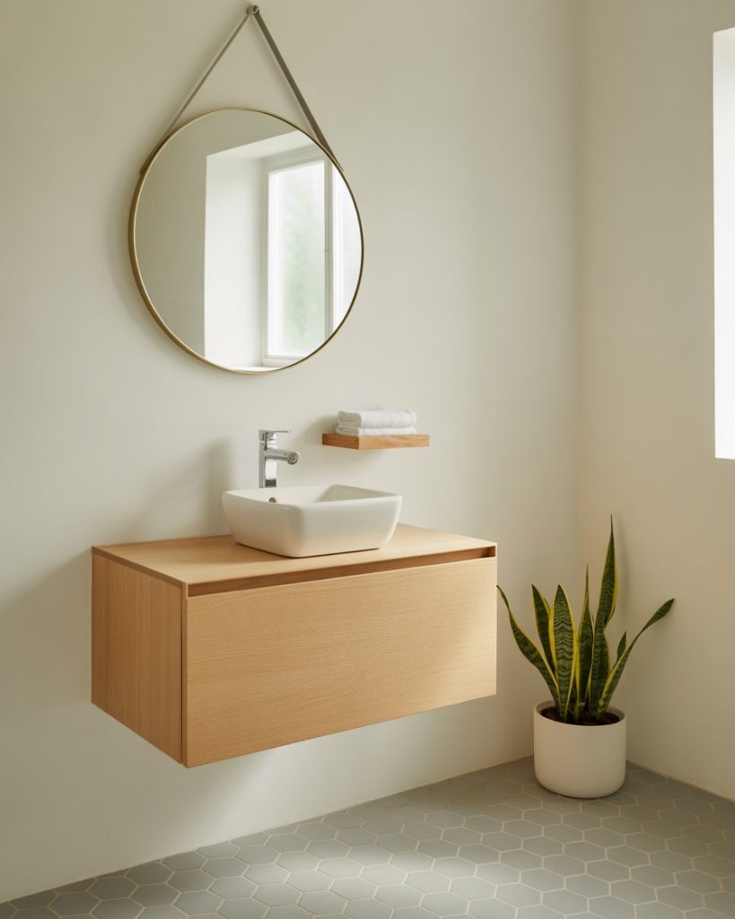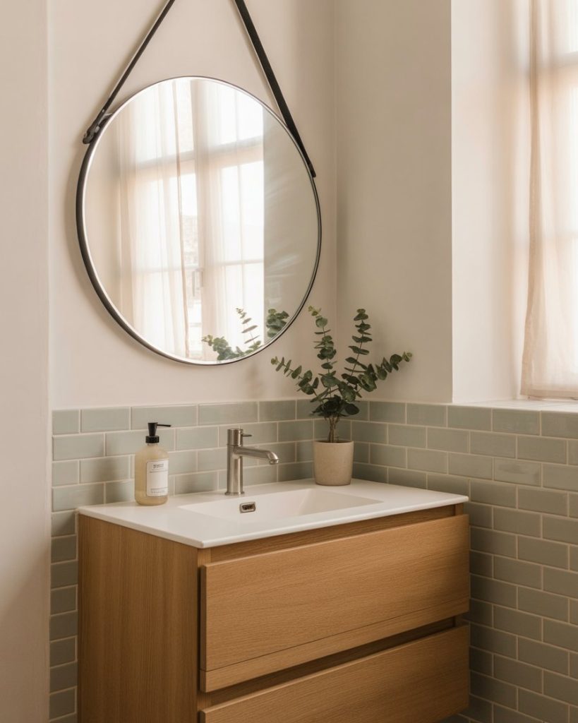 A simple Scandinavian half bath focuses on light wood, clean tiles, and soft neutrals that make even a tight room feel breathable. A round mirror and slim vanity keep the layout airy, while a single plant adds quiet life. This look appeals to homeowners who love order, warmth, and a stress-free visual flow. Perfect for families who want a powder room that always looks tidy without constant styling.