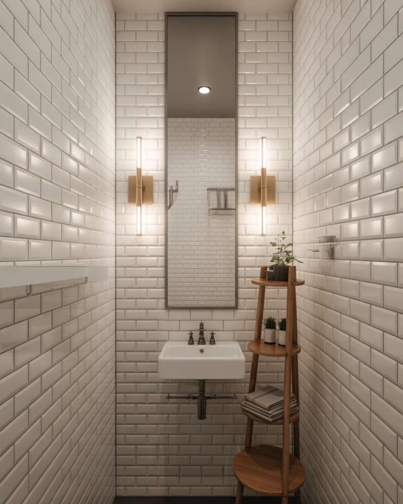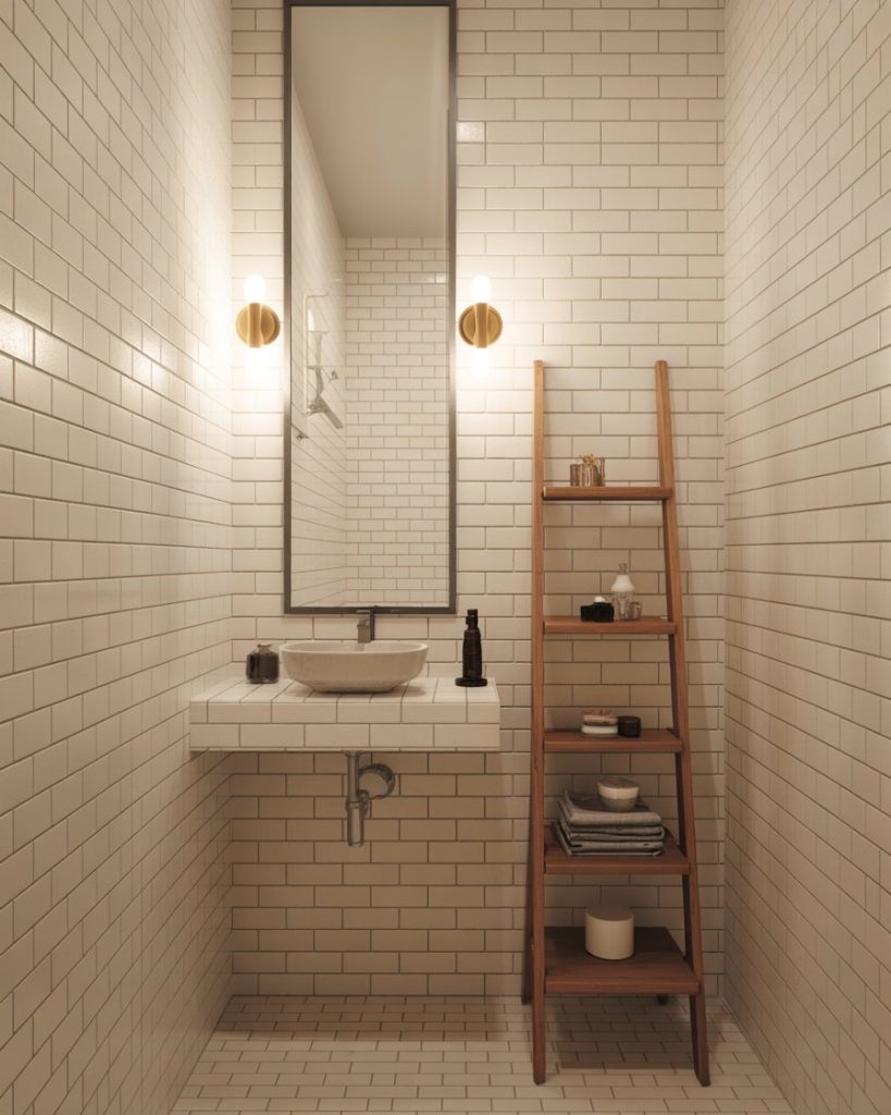 A narrow powder room can still feel balanced by styling upward. Tall mirrors, vertical tile, and ladder shelves pull the eye toward the ceiling, making the space feel intentional instead of squeezed. Designers often suggest slim sconces instead of wide fixtures to preserve wall space. Great for townhouses and older homes where plumbing dictated awkward floor plans.