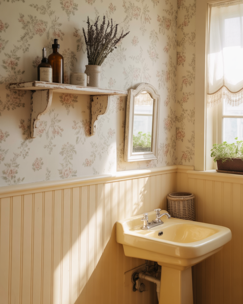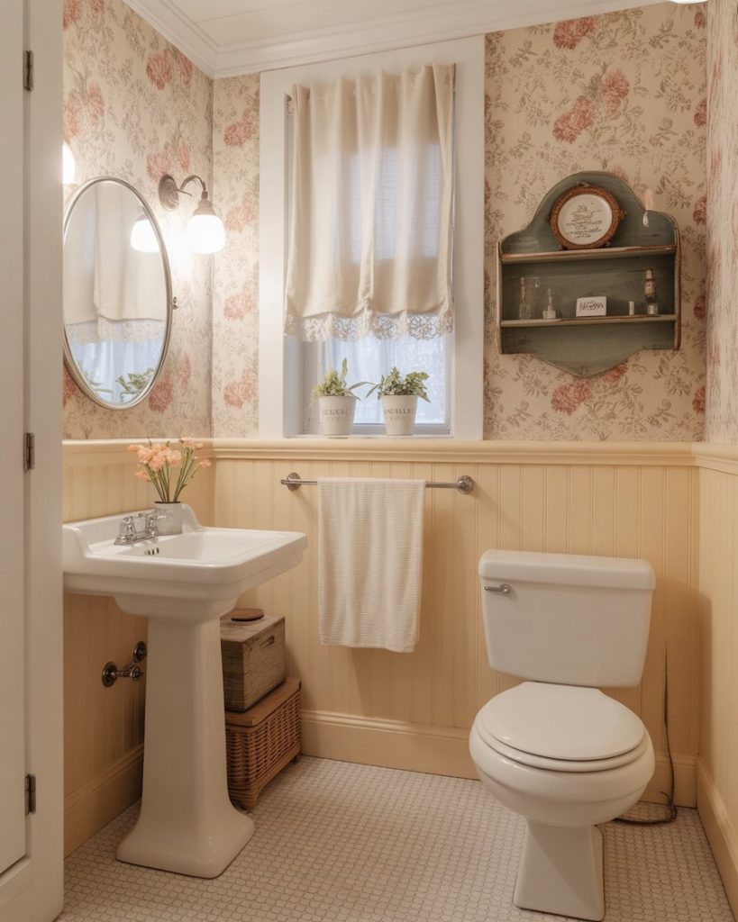 The cute cottage half bath with soft florals, beadboard, and pastel tones tells a story. It’s charming without trying too hard, especially with the gingham hand towels or antique wall shelf. This style works in both city apartments and country homes—anywhere you want a pause of sweetness before heading back to real life.