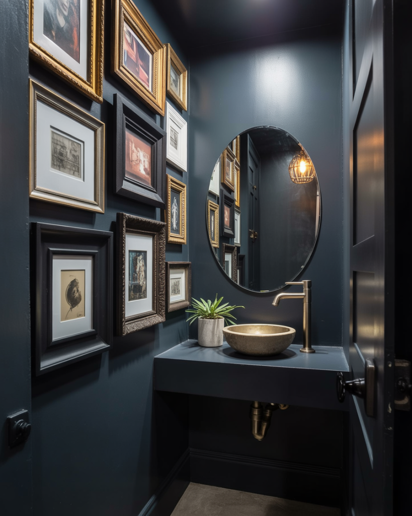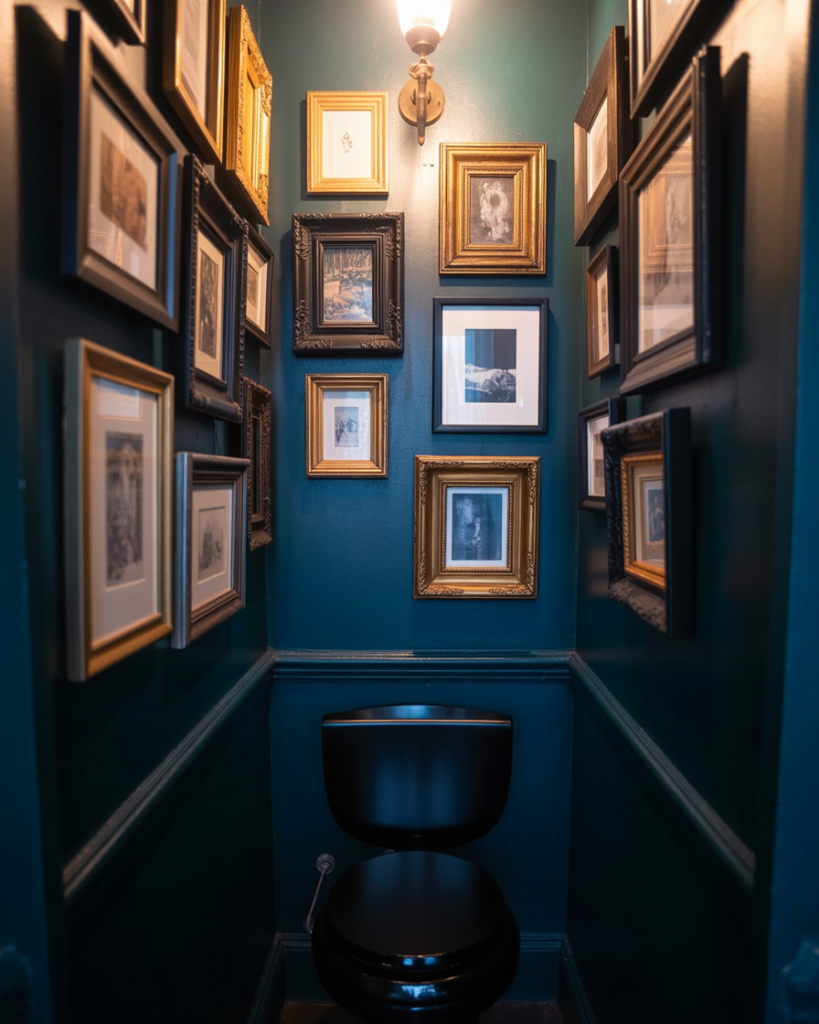 The moody, art-filled half bath turns the walls into a mini gallery. Rich wall colors make framed prints and vintage posters or family photos stand out. Mixing frame sizes lets the collection feel curated rather than cluttered. A tiny room like this lets you experiment with pieces that might feel too bold in the living room.