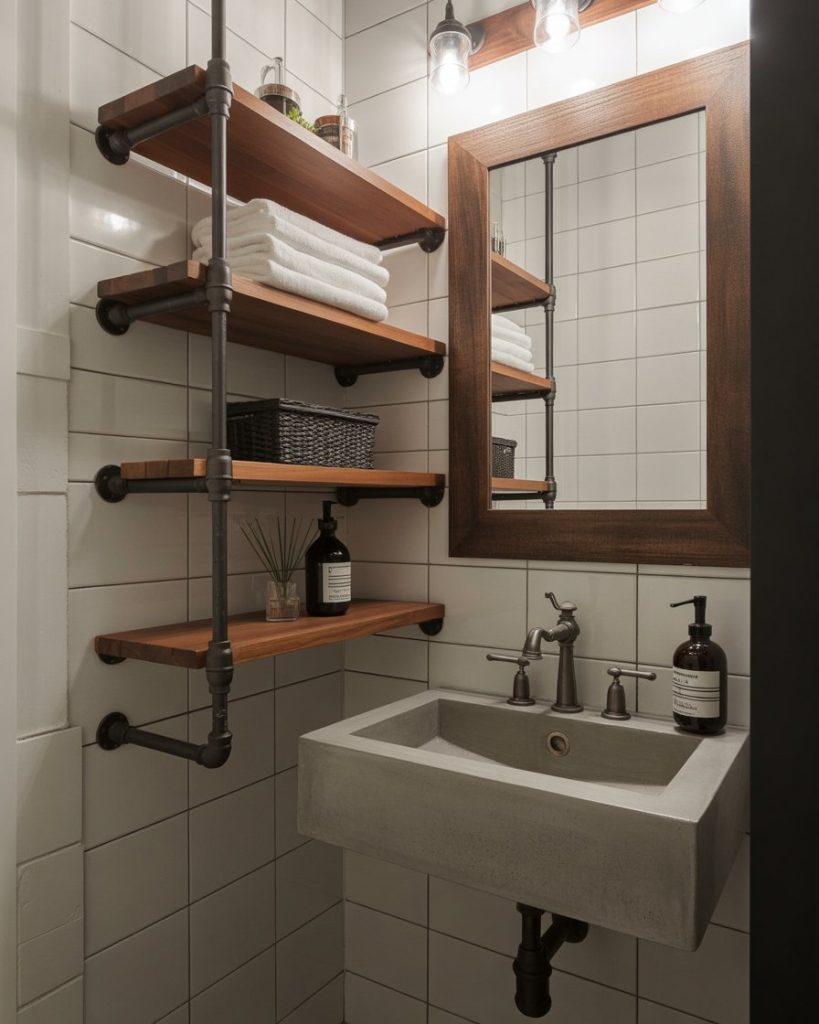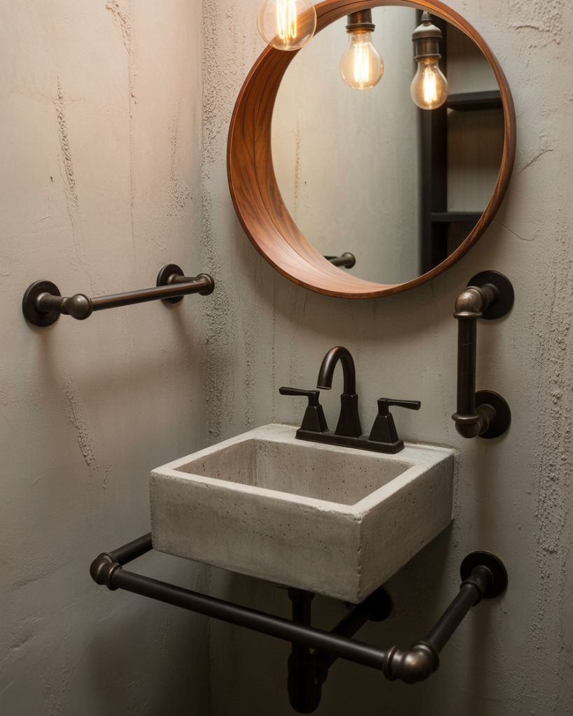 An industrial half bath pairs concrete, exposed pipe, and matte black fixtures for a grit-meets-polish effect. The look is unexpectedly chic in lofts or basements, especially when softened with a warm wood mirror frame. It’s budget-friendly too—unfinished materials are part of the style.