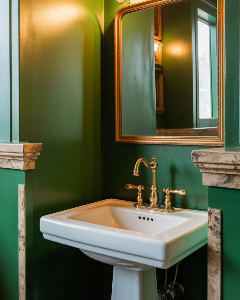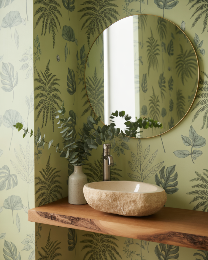 A green botanical half bath uses leafy prints, eucalyptus bundles, and natural stone to bring the outdoors in. Even renters can add peel-and-stick foliage wallpaper and a bamboo shelf. The result feels fresh, calming, and spa-adjacent—ideal for homes without room for a full wellness bathroom.
