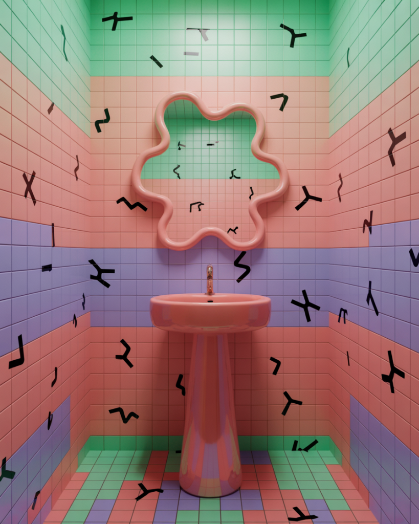 A funky Memphis-inspired half bath channels the 80s with squiggle shapes, bubble mirrors, and candy-colored tile. Interior trendsetters note this style works best in short doses—exactly why a powder room is perfect. It’s playful, ironic, and guaranteed to surprise any guest.