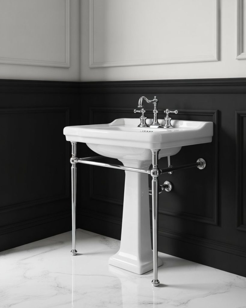 An elegant black-and-white palette never dates. Marble penny tile, chrome faucets, and crisp paint lines make the space look pricier than it is. Add a single bold stripe or framed sketch to avoid sterility. Works in both traditional and modern homes.