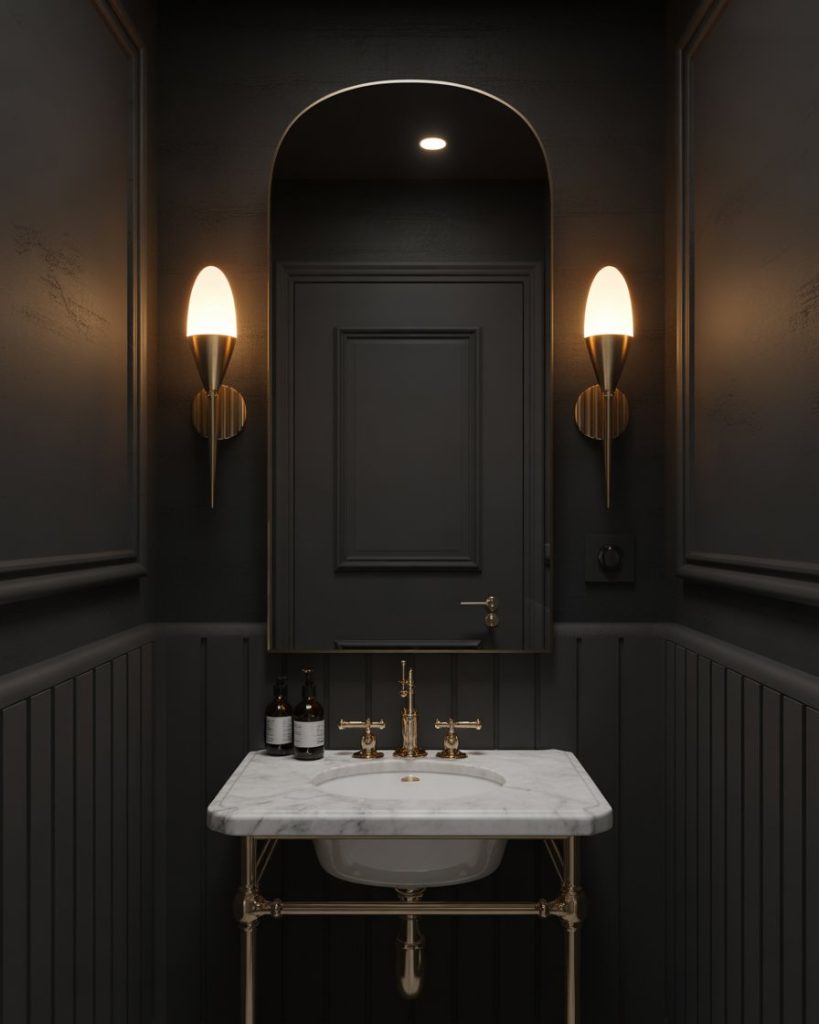 A dark, moody palette transforms a small bath into a dramatic surprise. Deep charcoal or inky navy walls paired with warm brass hardware feel elegant and artistic. I once painted my own powder room nearly black, and every visitor mentioned it—it proves small rooms can handle big style. Good lighting is the secret: sconces, mirrors, and one standout fixture keep things from feeling cave-like. Perfect for anyone craving a bold look without redecorating the whole house.