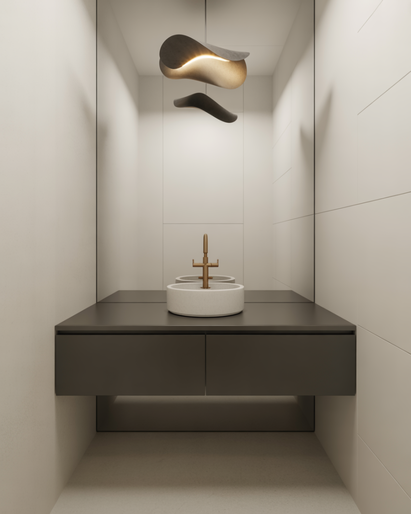 A modern minimalist half bath relies on clean geometry, hidden storage, and quiet color. Floating cabinets and frameless mirrors help a narrow space breathe, while matte finishes add subtle texture. Designers note that fewer visual breaks can actually make a small room feel larger. One oversized light or sculptural faucet becomes the star, proving simplicity can still impress guests.