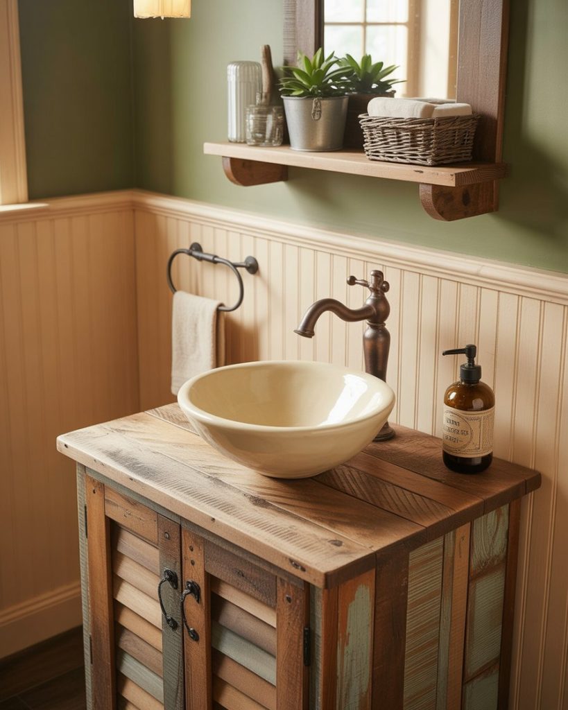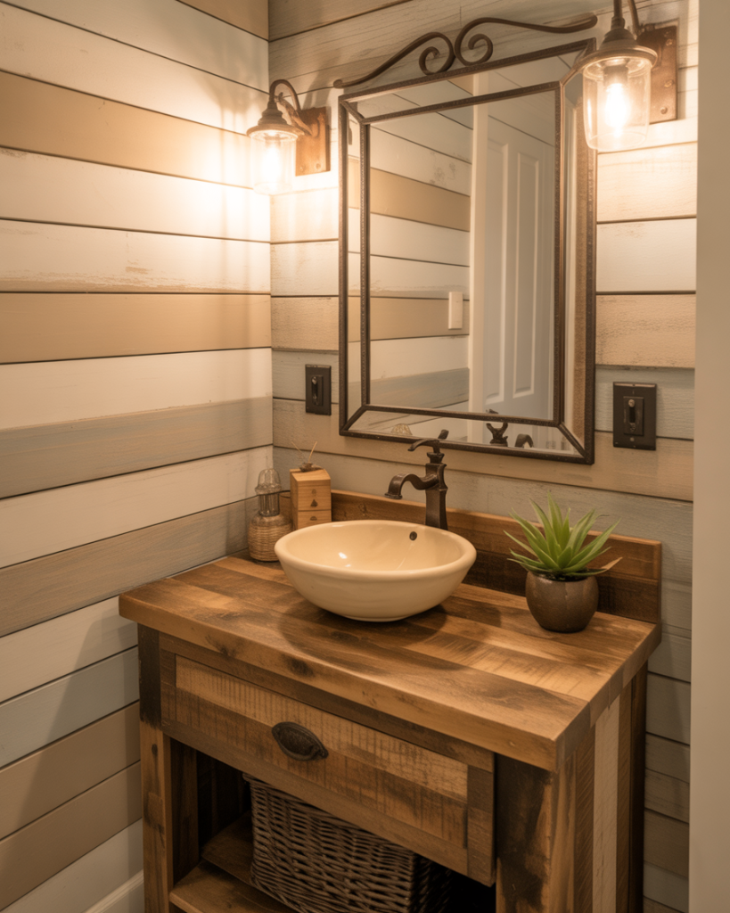 A farmhouse half bath with a sliding barn door saves space and adds character before guests even step inside. Inside, shiplap walls, vintage hooks, and enamel accessories keep the theme cohesive. It’s a smart choice for hallways where a swinging door would block traffic.