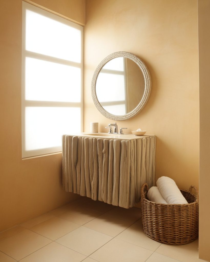 A coastal half bath doesn’t need seashells to feel seaside. Soft sand tones, rope details, and driftwood-framed mirrors create a breezy mood. Keep the palette simple and airy to avoid theme-park kitsch. This design calms busy households and brings summer energy into landlocked homes. A striped rug or woven basket adds texture without clutter.