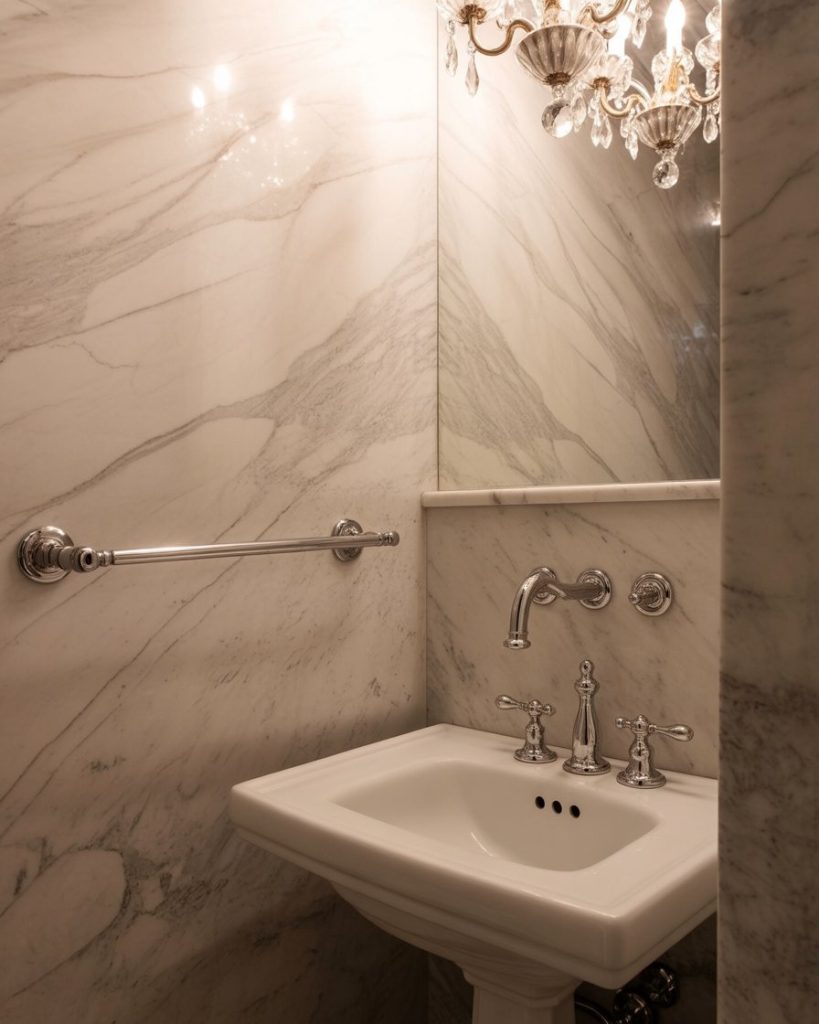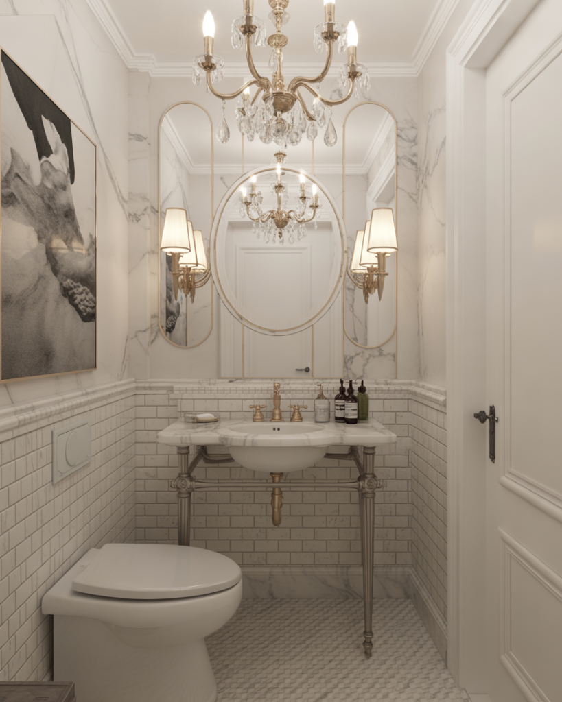 An elegant powder room turns its small footprint into an advantage—less square footage means you can splurge on marble, polished nickel, or even a petite chandelier. Houzz pros advise choosing one luxury focal point so the room feels curated instead of crowded. It’s the quickest way to give guests that boutique-hotel surprise.