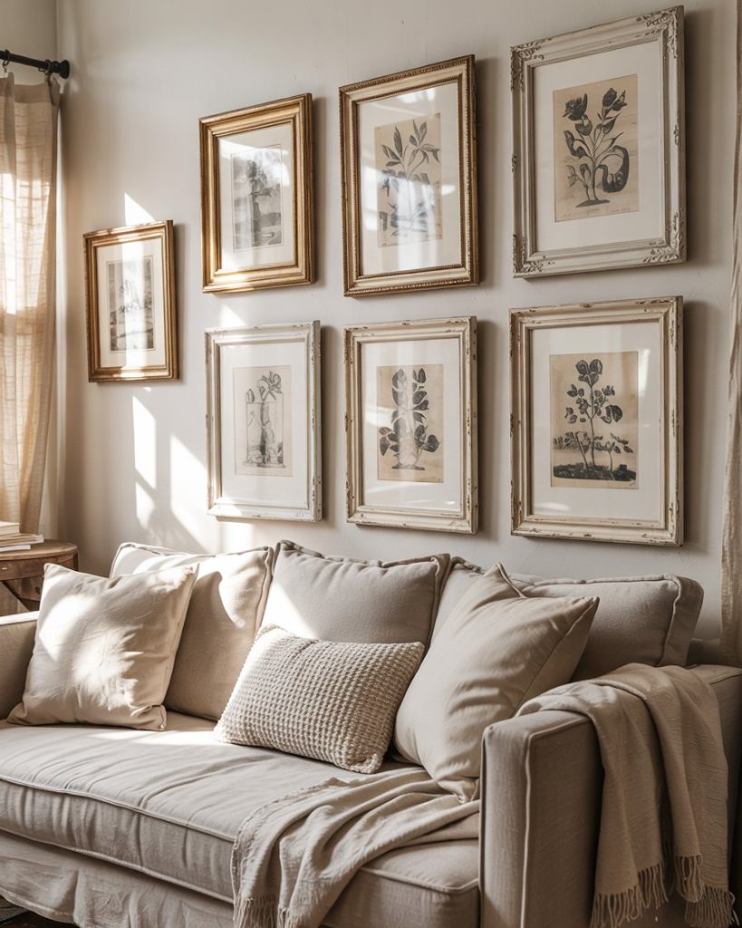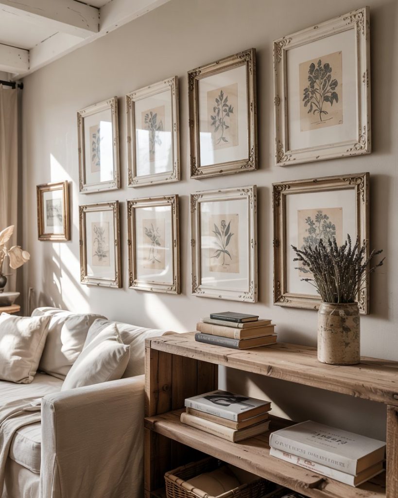 Farmhouse style thrives on pieces with history, and wall decor is the perfect place to show it. Mix antique mirrors, framed seed packet prints, or reclaimed window frames for nostalgic charm. These accents pair well with a grey couch or neutral color schemes, adding personality without clutter. Curating pieces with meaning makes the room feel lived in, not staged, which is the true spirit of farmhouse warmth.