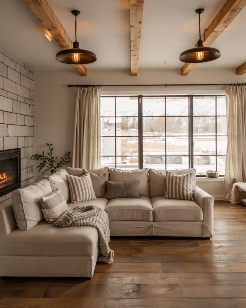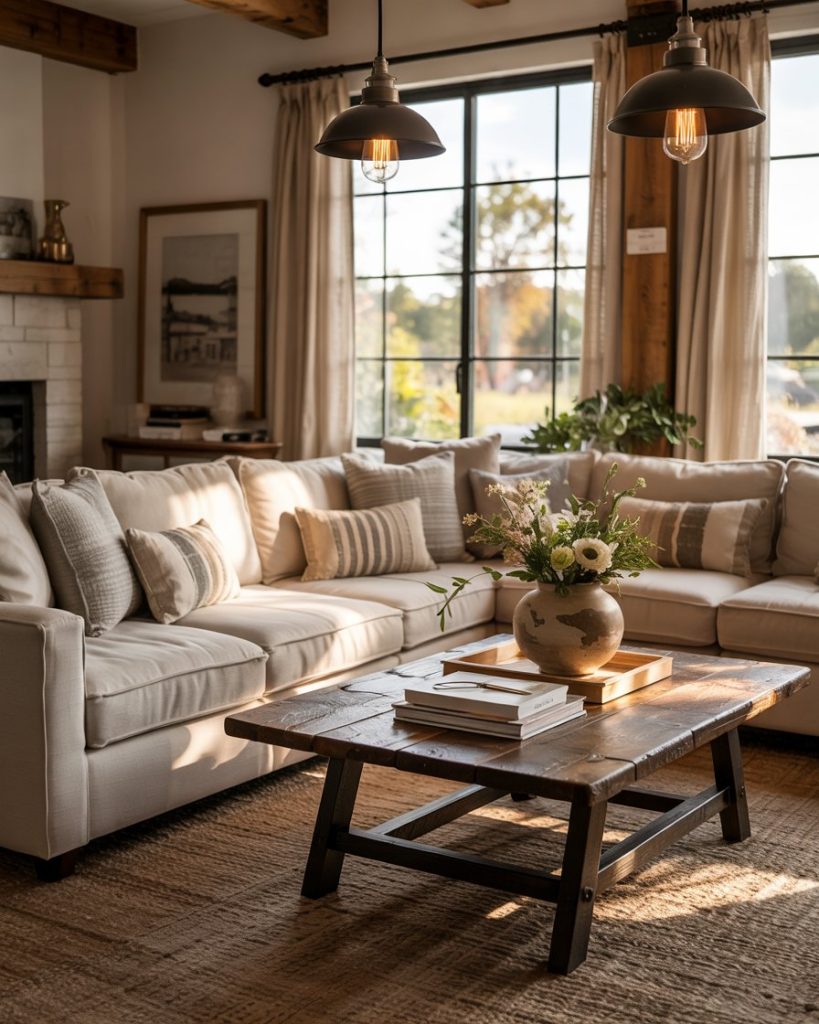 Bold lighting turns a simple room into a design statement. Think black metal pendants, lantern-style sconces, or vintage bulb chandeliers. The mix of farmhouse charm and industrial edge gives balance to cozy textures. These lights work perfectly over furniture groupings or near fireplaces, creating warm conversation zones and spotlighting your best decor ideas.