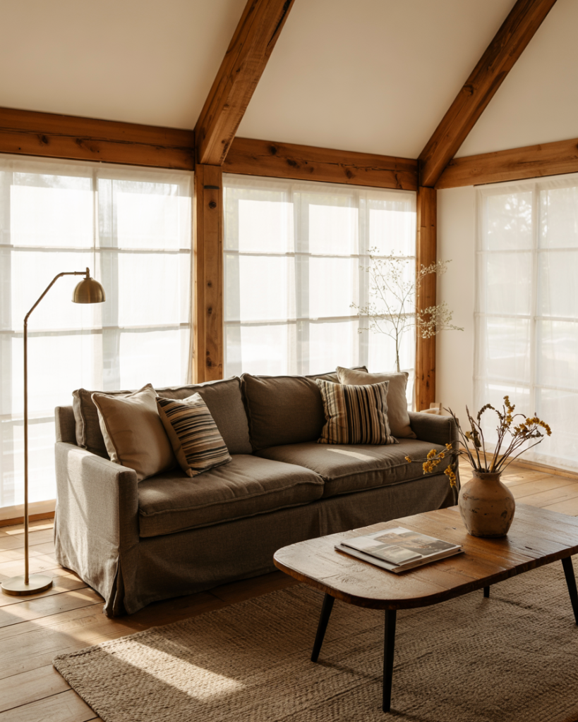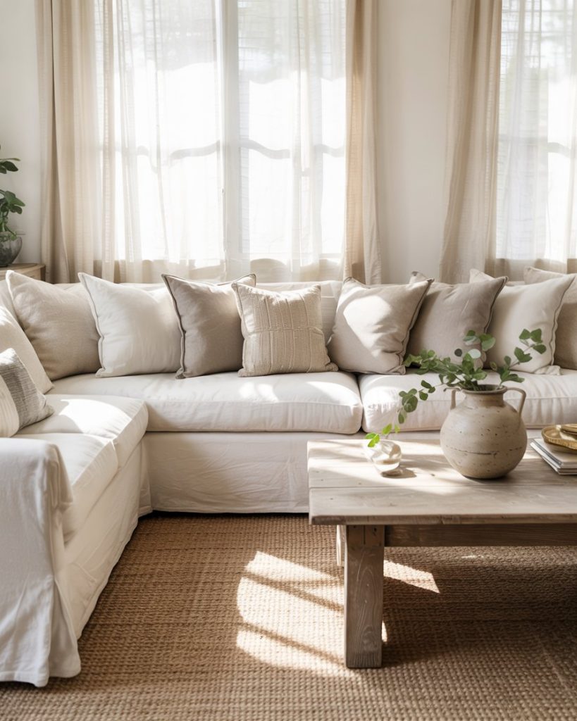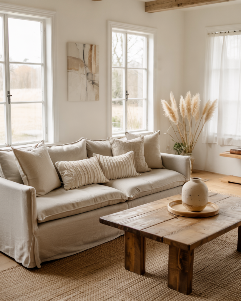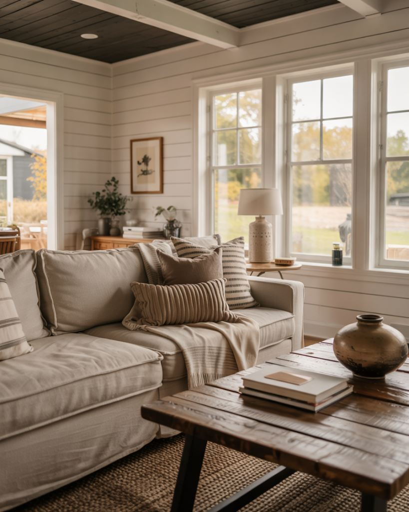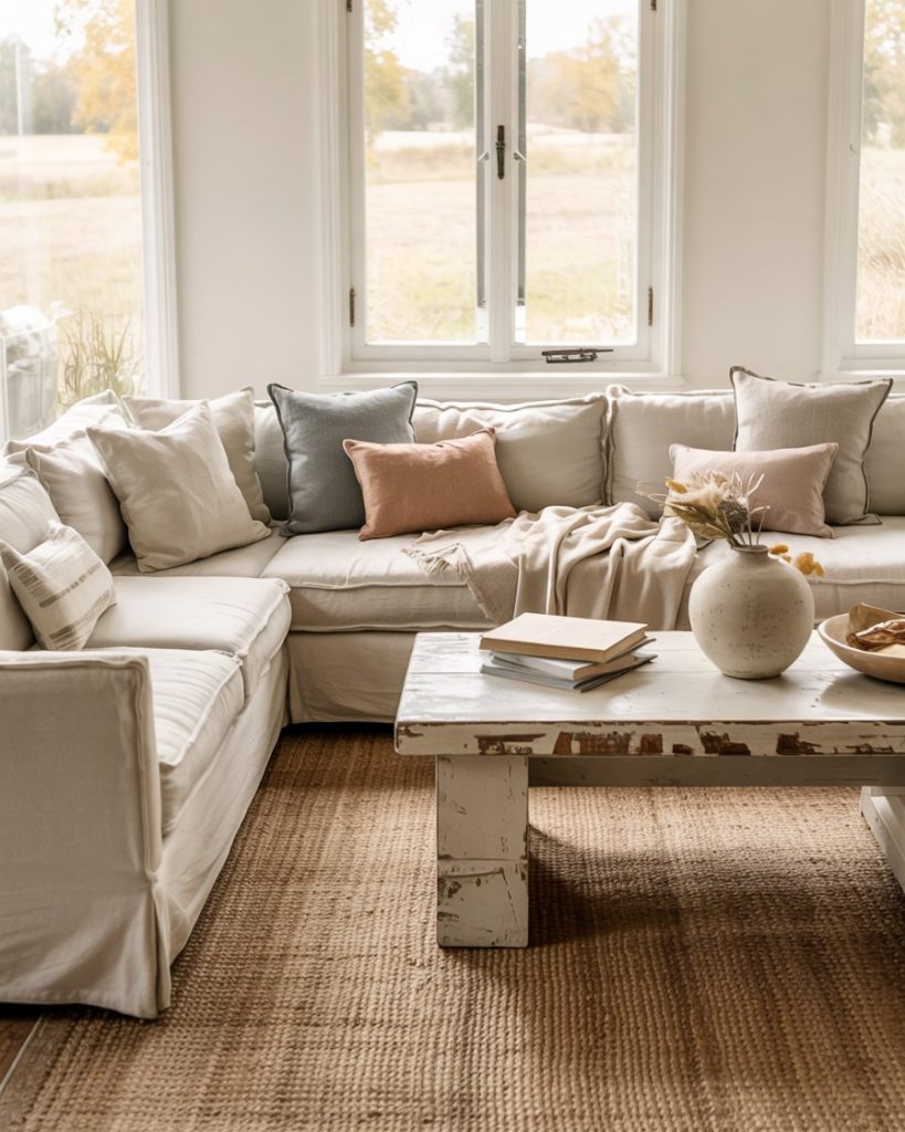 Slipcovered furniture is a farmhouse classic for a reason—it’s washable, relaxed, and visually soft. White, oatmeal, or stone-colored covers pair with woven throws and layered rug textures for effortless comfort. This style works especially well for families, pets, and high-traffic rooms, proving that beautiful spaces can still be lived in fully.